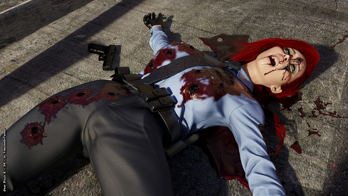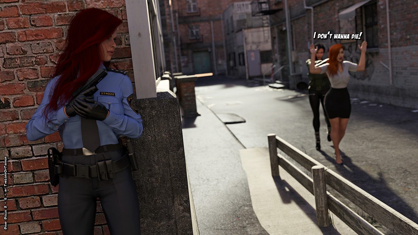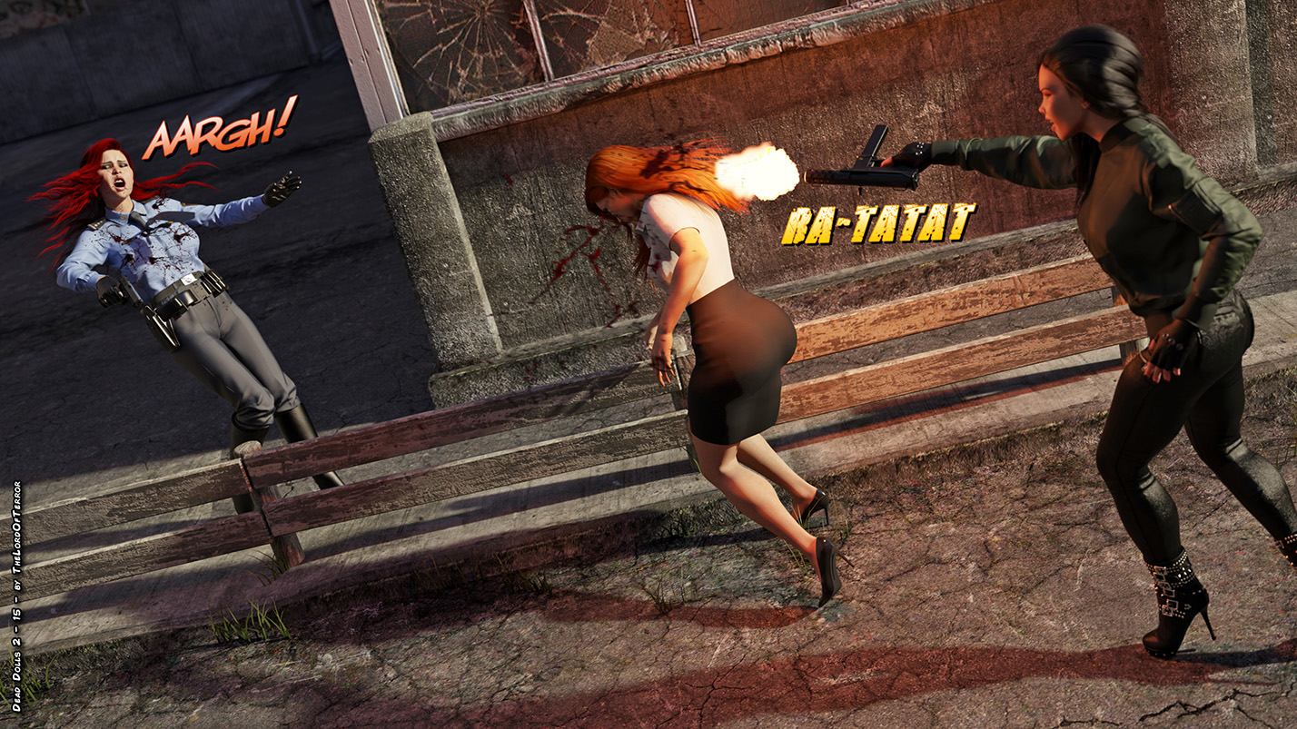 A criminal is helding a hostage and a cop will try to stop her, but she will kill both using her machinegun and filling them with bullets. Later they will be taken to the morgue.