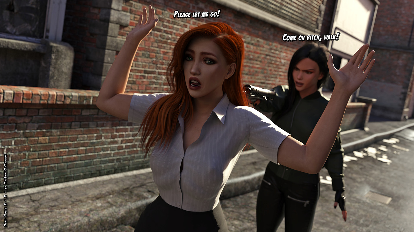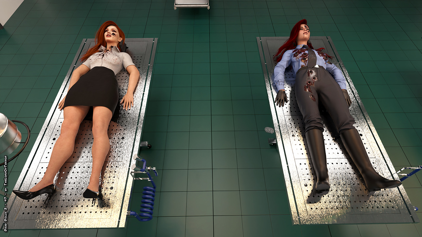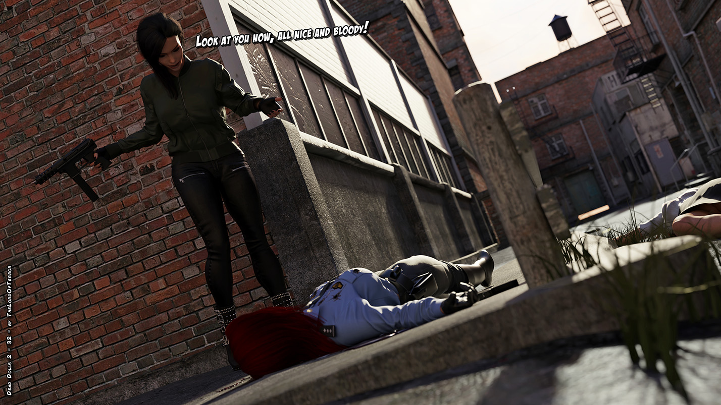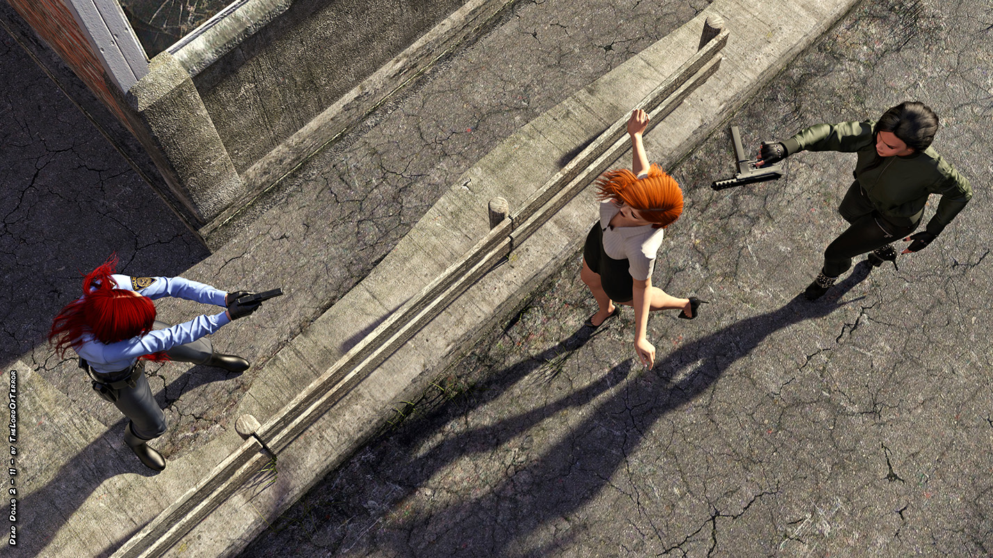 A criminal is helding a hostage and a cop will try to stop her, but she will kill both using her machinegun and filling them with bullets. Later they will be taken to the morgue.
