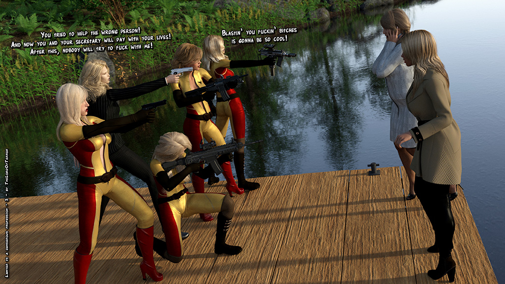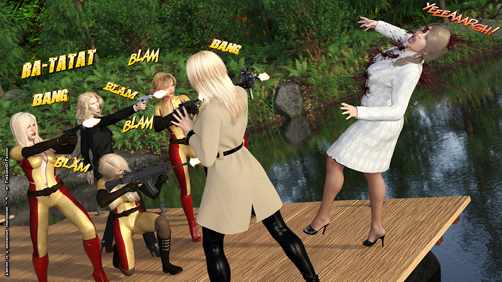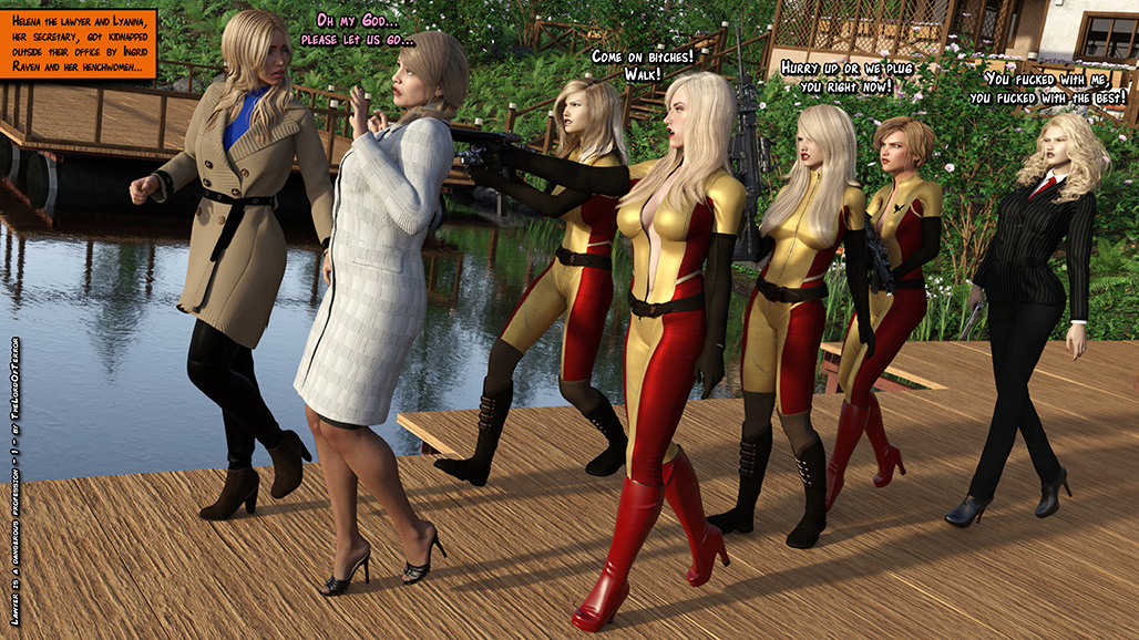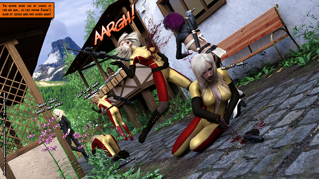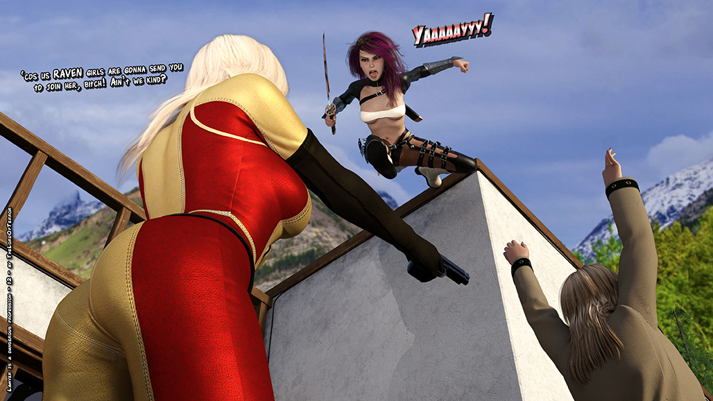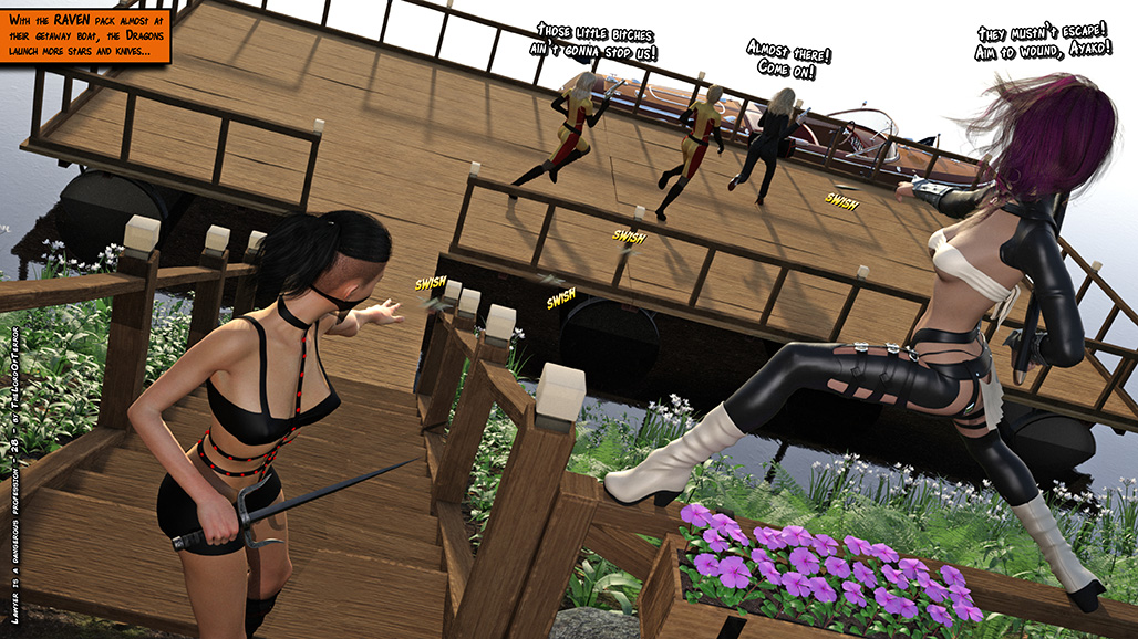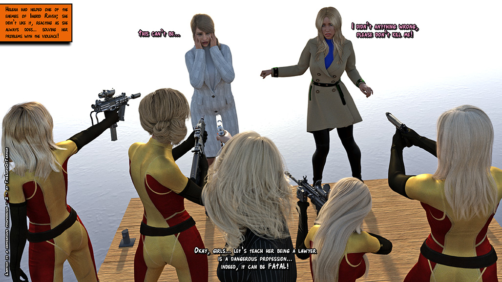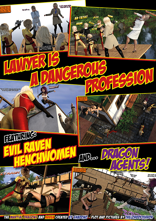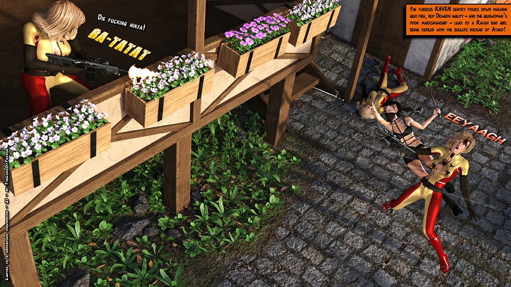 The evil Raven Henchwomen kidnap a lawyer and her assistant, they kill the lawyer and ask a ransom for the assistant. But two Dragon ninjas will attack them to save the girl! Sword slashes, knife hits, shuriken throws and machinegunnings for a total of 7 deaths and 2 wounded!