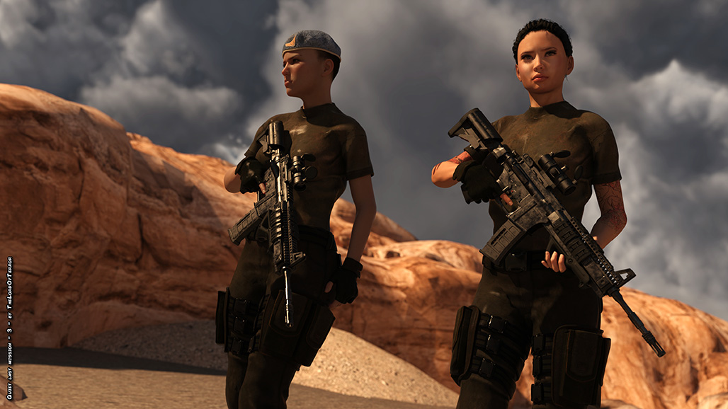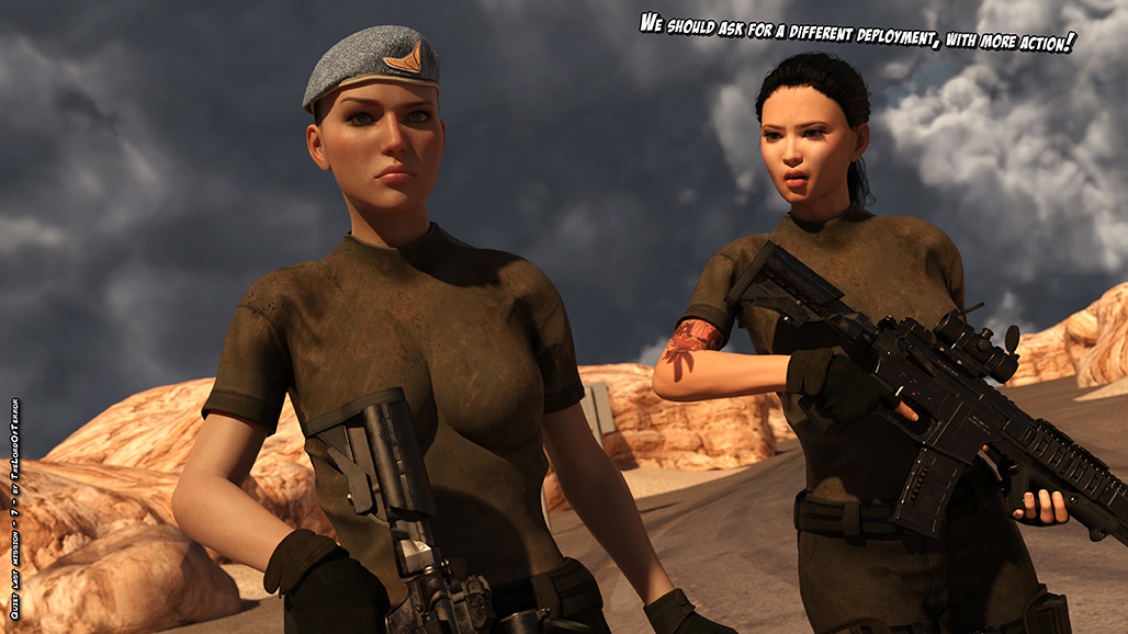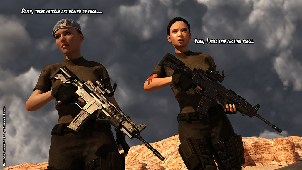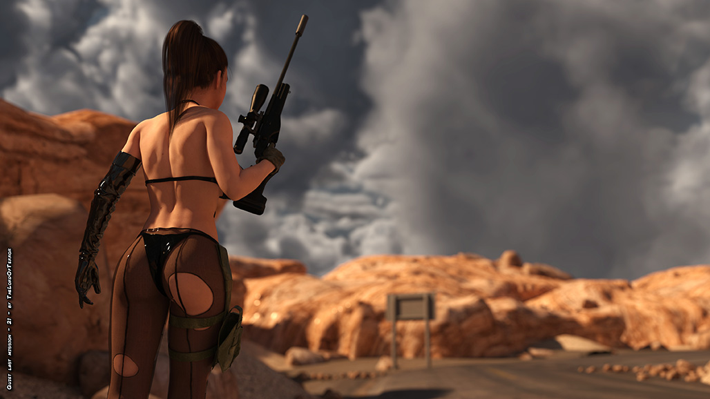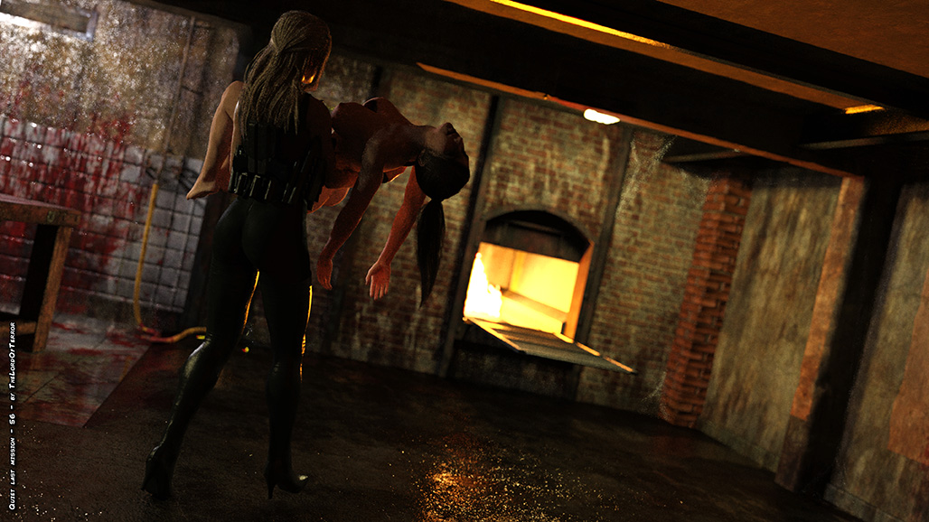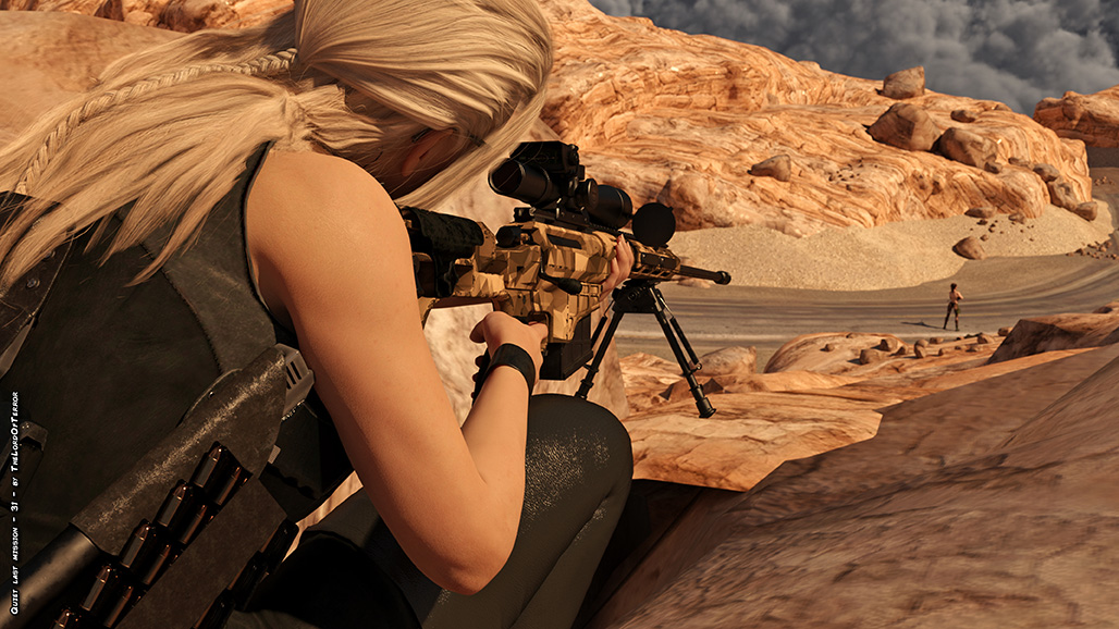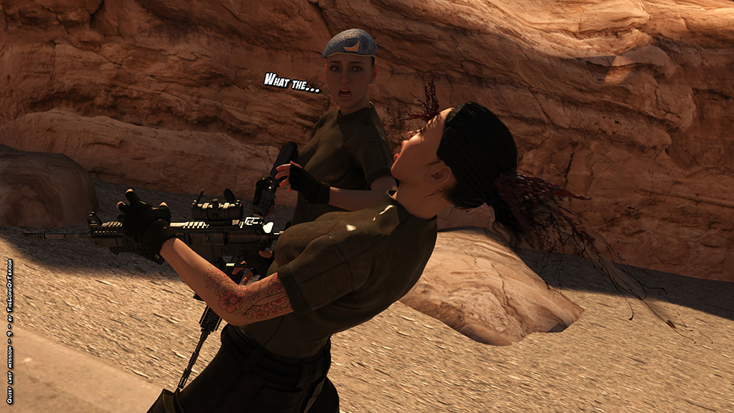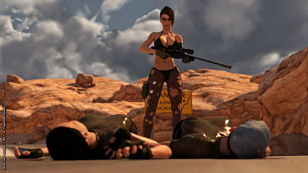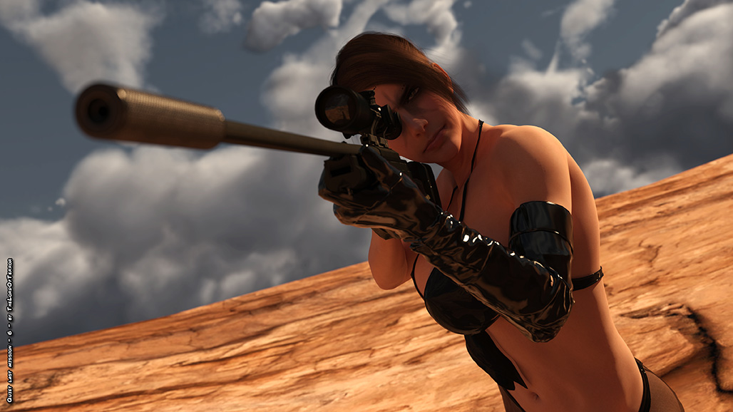 Silent the sniper takes out two patrolling guards, one with a single headshot, the second with a chest shot and the eye. Then she checks their bodies looking for a keycard, but she didn’t noticed that another sniper was aiming at her, shooting one single bullet that perforates her chest. Later she’s taken to the morgue for inspection, along the two soldiers!