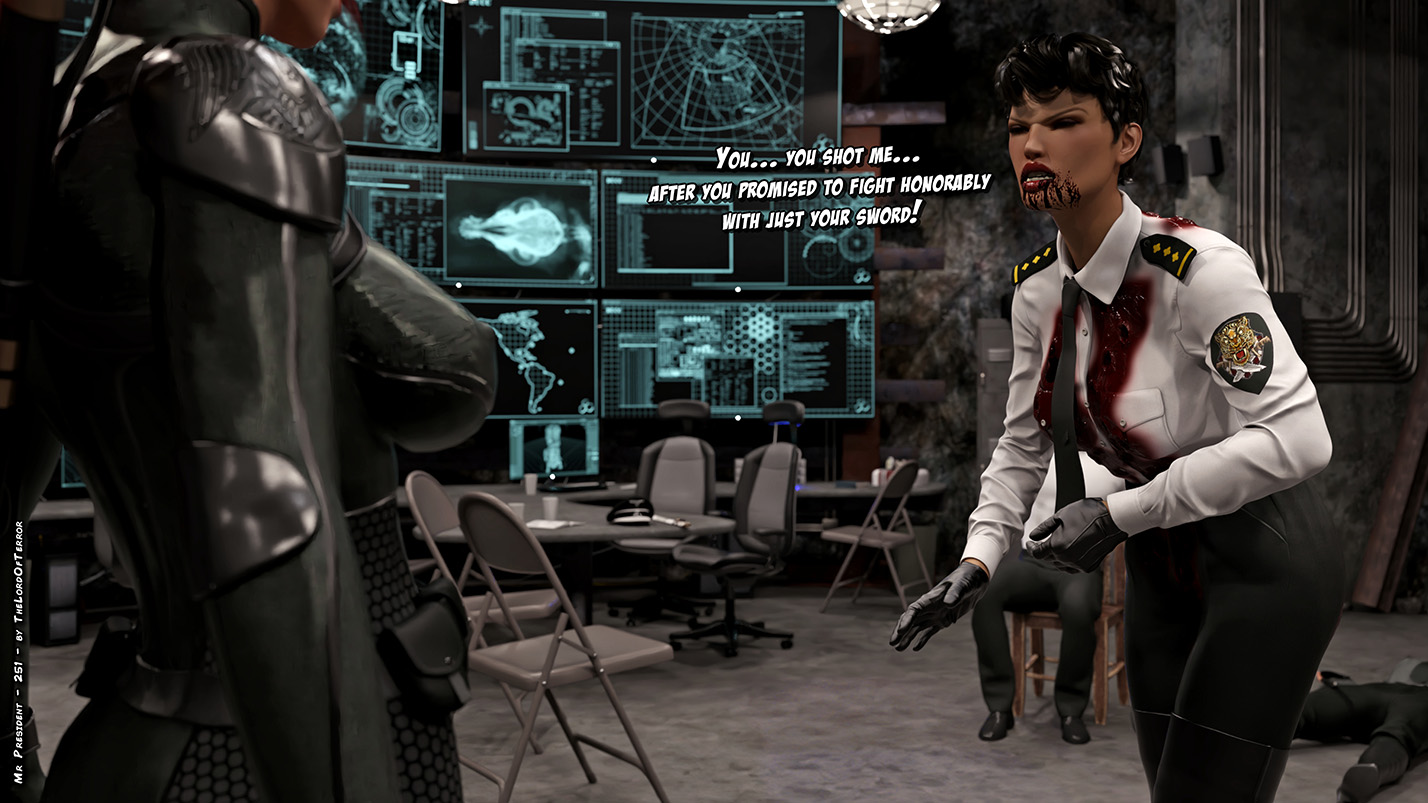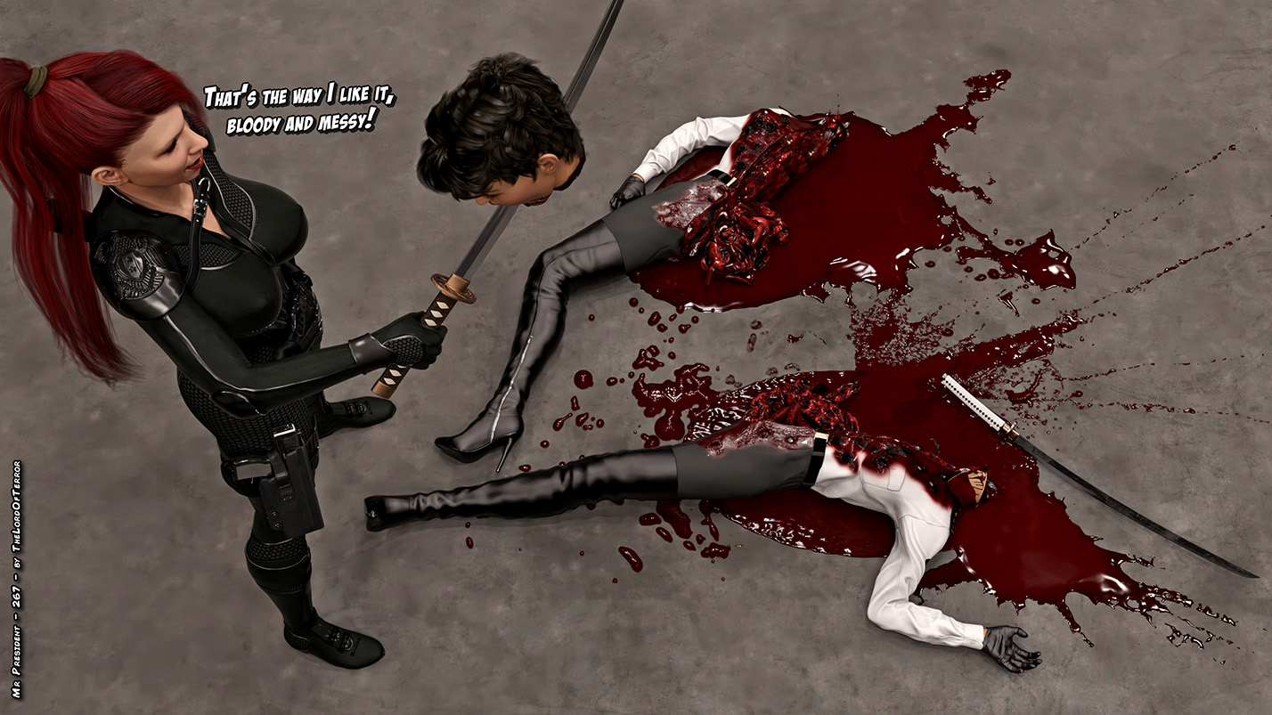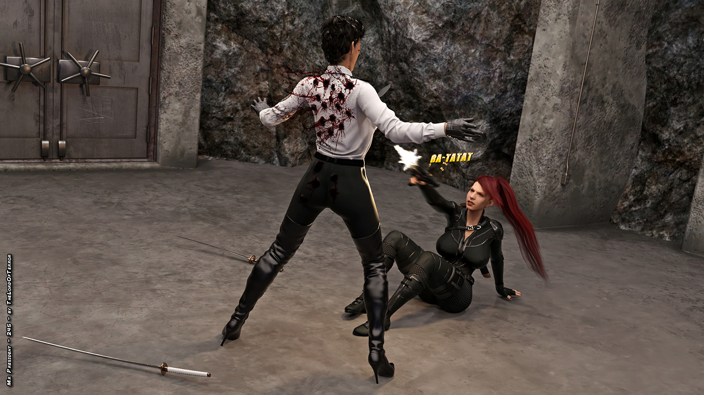 The ninja reaches the main room: after quickly killing the right hand of the leader, they have a sword duel. The ninja is going to lose… but she prefers to live and shoots the terrorist leader, then she finish her with a very gory fatality!