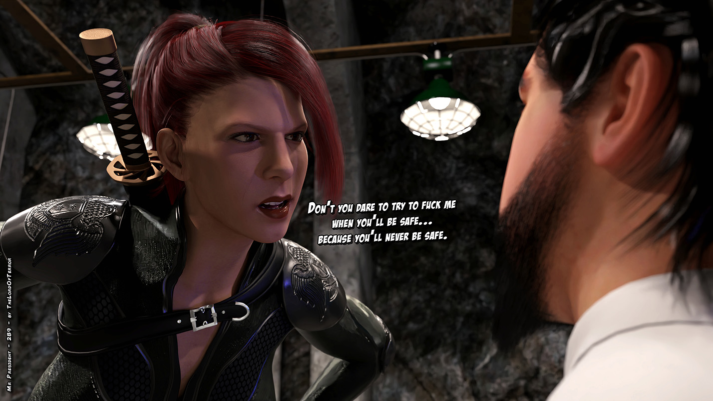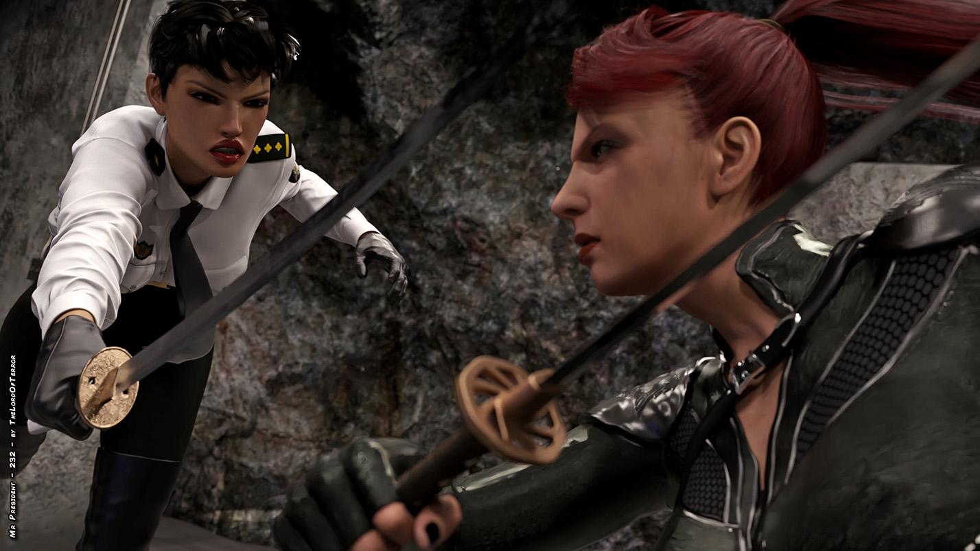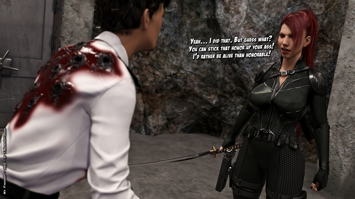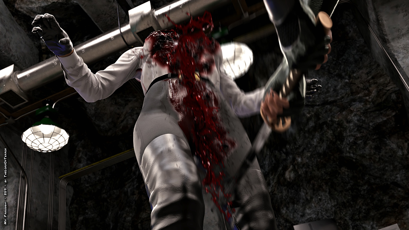 The ninja reaches the main room: after quickly killing the right hand of the leader, they have a sword duel. The ninja is going to lose… but she prefers to live and shoots the terrorist leader, then she finish her with a very gory fatality!