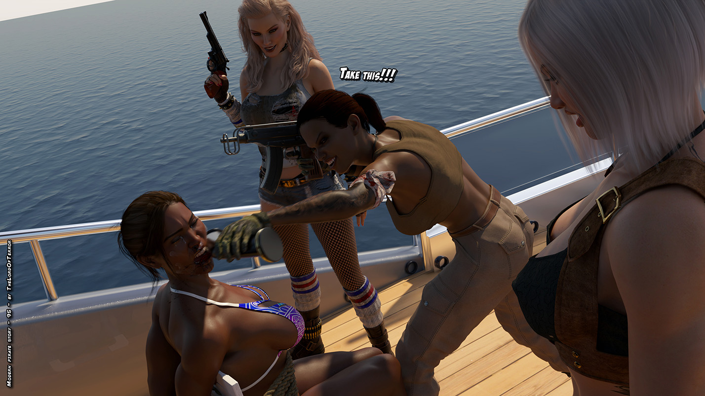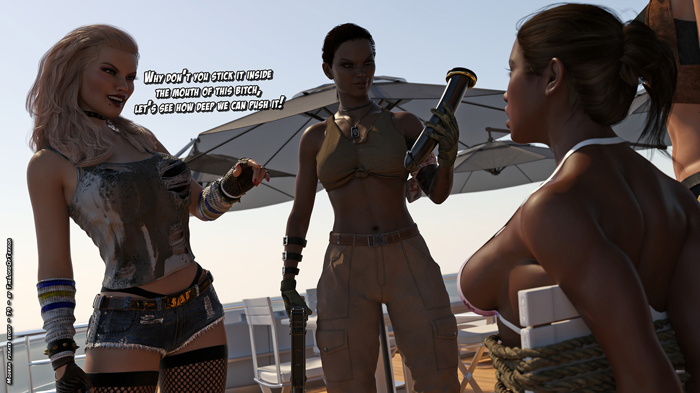 On a luxury yatch a group of women are having some lesbo fun together, but some nasty female pirates will assault them looking for jewelries, so they will torture the girls to know where these are hidden! One girl will be brutally beaten, the other one will be tied to a chair, beaten and a huge dildo will be pushed in her throat!