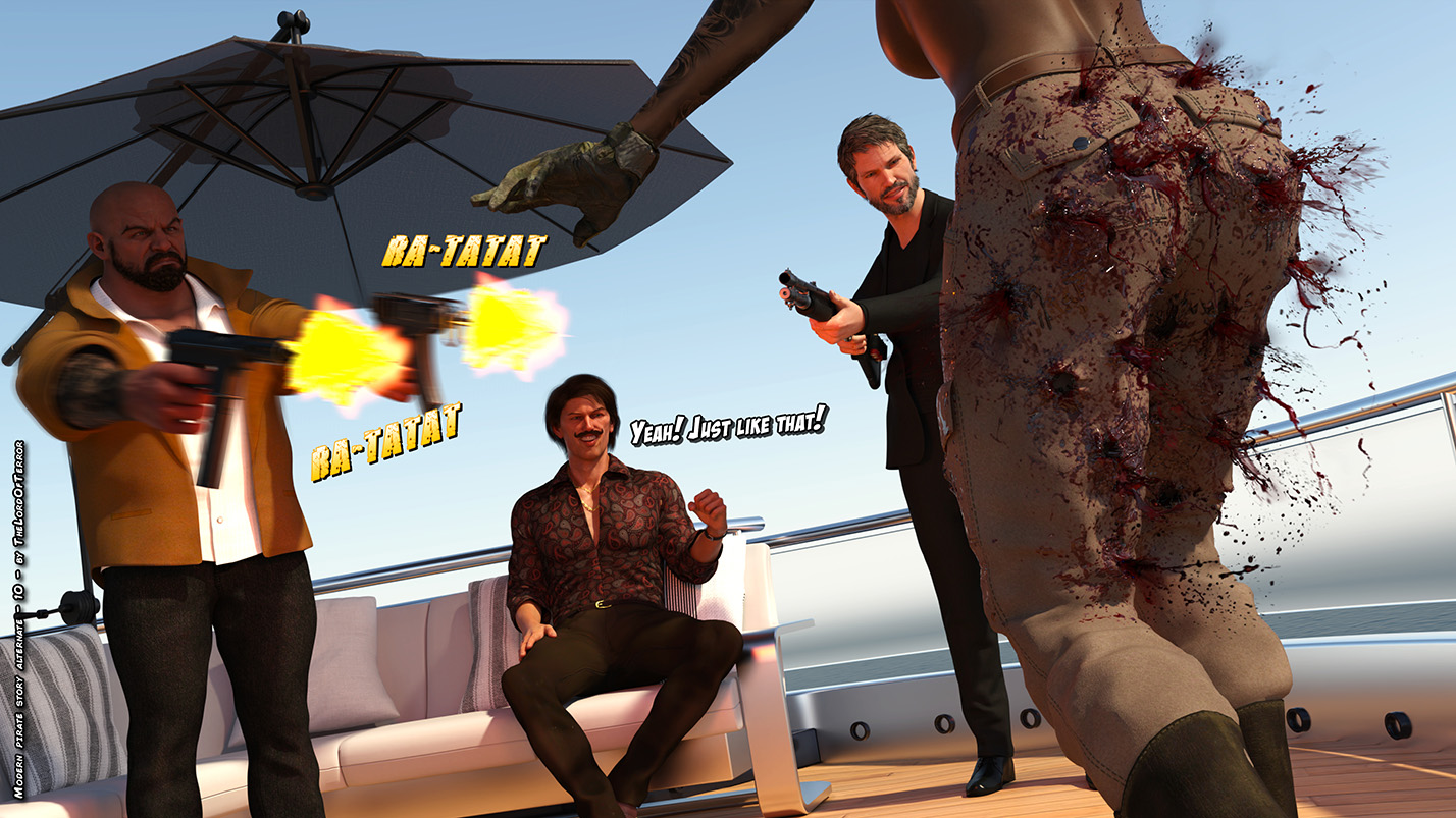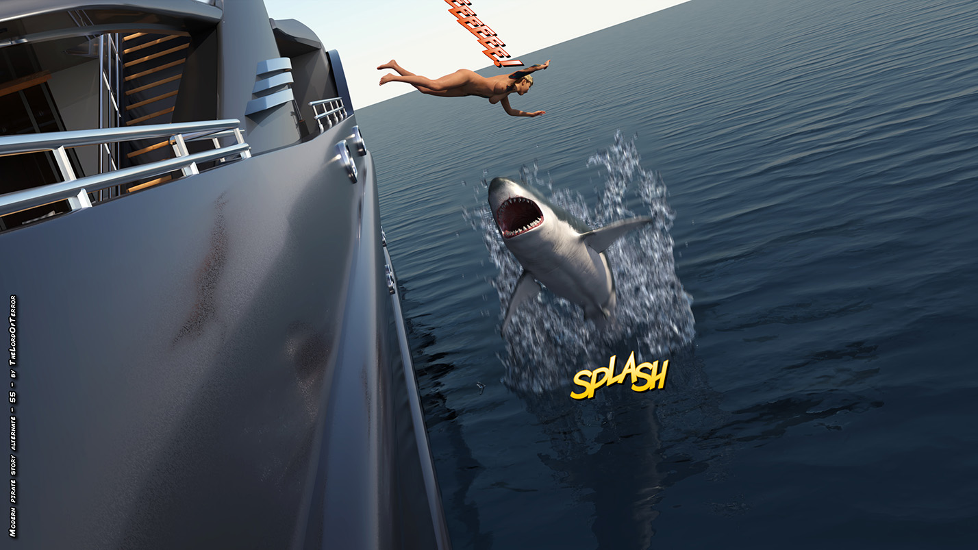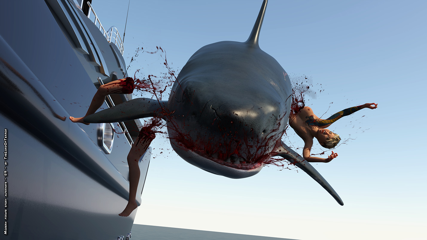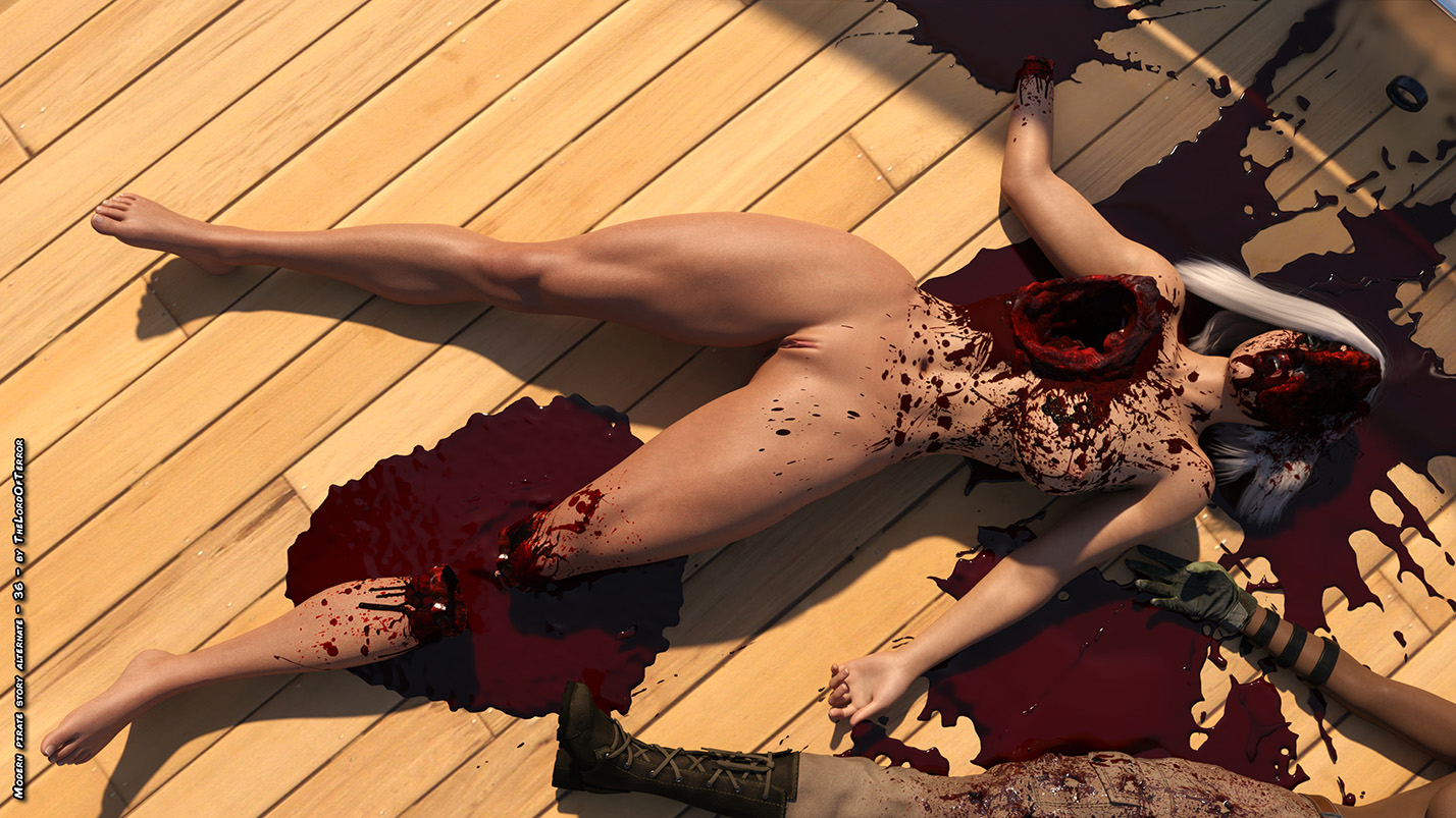 Alternate ending with the owner of the boat dealing with the pirates in different ways! One will have her legs filled with bullets, the second one will be mutilated with a shotgun, the third will be thrown to the sharks and the leader will be brutally eviscerated and decapitated!