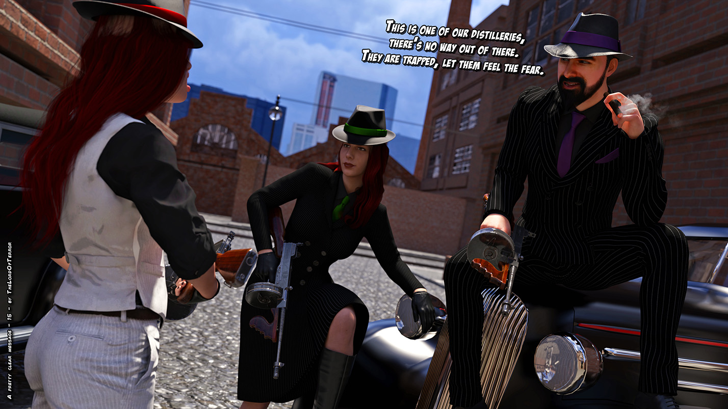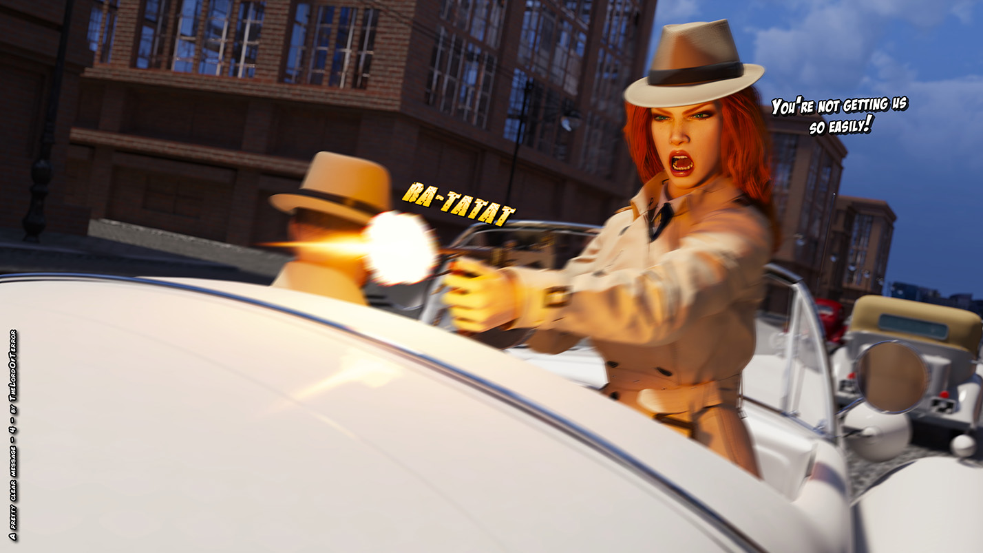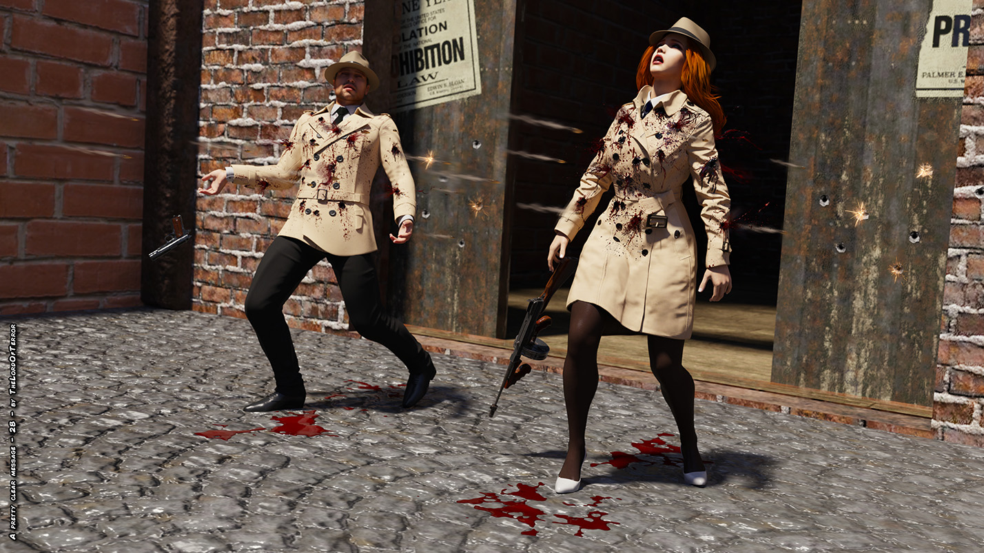 A couple of gangsters are running away from their enemies, but they end up trapped with no way out. They decide to fight till death and they are both tommygunned and covered with bloody bullet holes! Later their bodies will exposed to leave a pretty clear message!