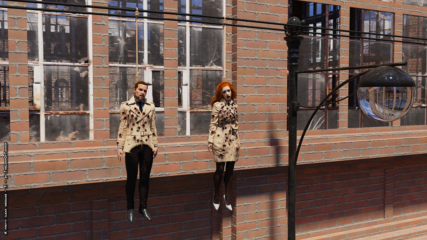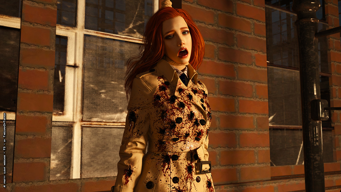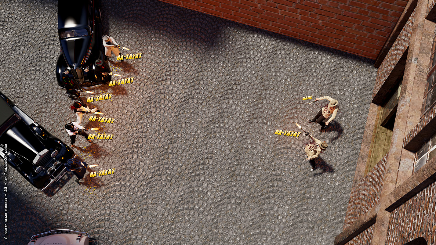 A couple of gangsters are running away from their enemies, but they end up trapped with no way out. They decide to fight till death and they are both tommygunned and covered with bloody bullet holes! Later their bodies will exposed to leave a pretty clear message!