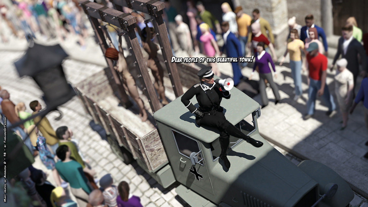 Angelica and her friend are having some intimate fun in their house in the woods when squad of nazi soldiers breaks in and cover them both with a rain of bullets, then the officer will walk in and finish her with a headshot! Later the bodies will be exposed in the streets of town.