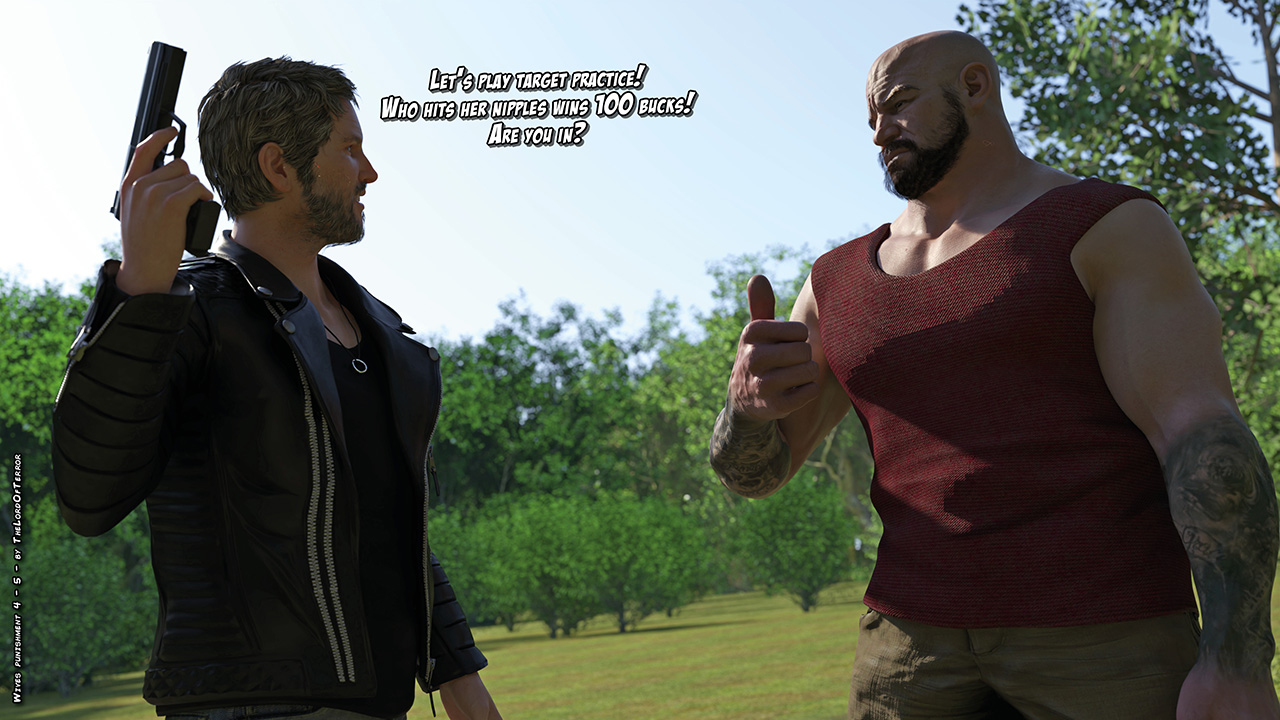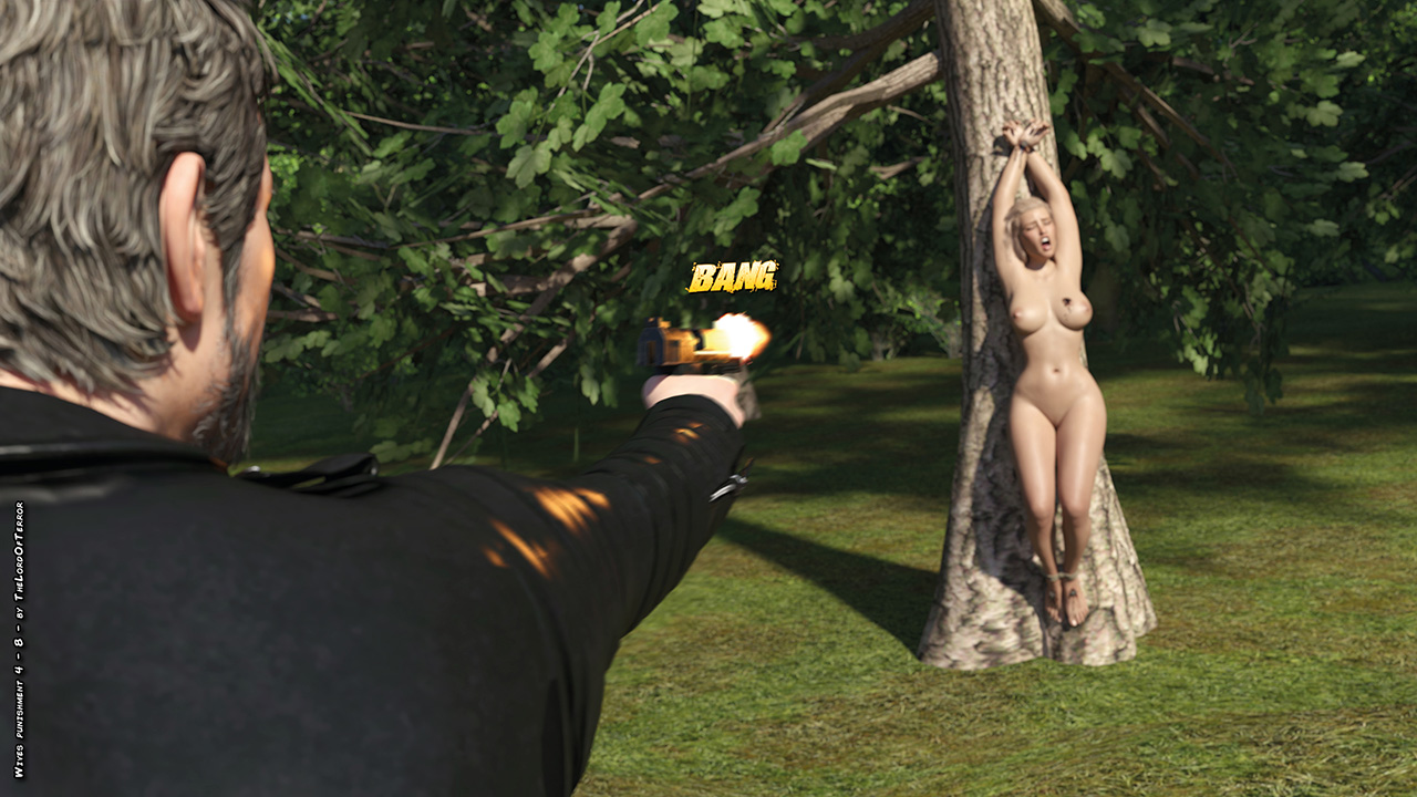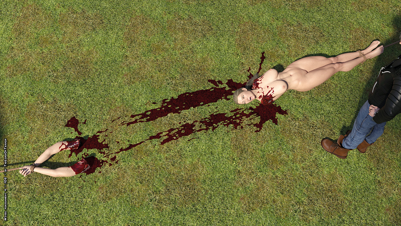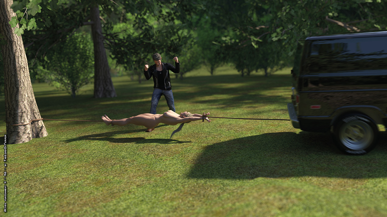 Alternate ending: first the two guys play target practice with the crucified girl, betting on who’s gonna hit her nipples; the second one will have a knee, an elbow and her head brutally hammered, while the last one will be tied between a tree and the van, pulling her body and ripping off her arms!