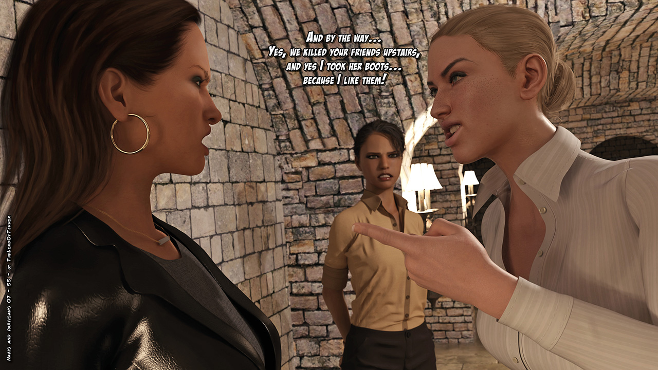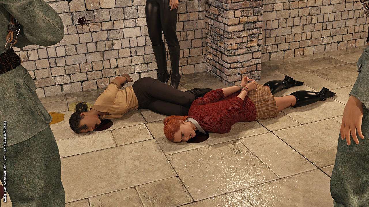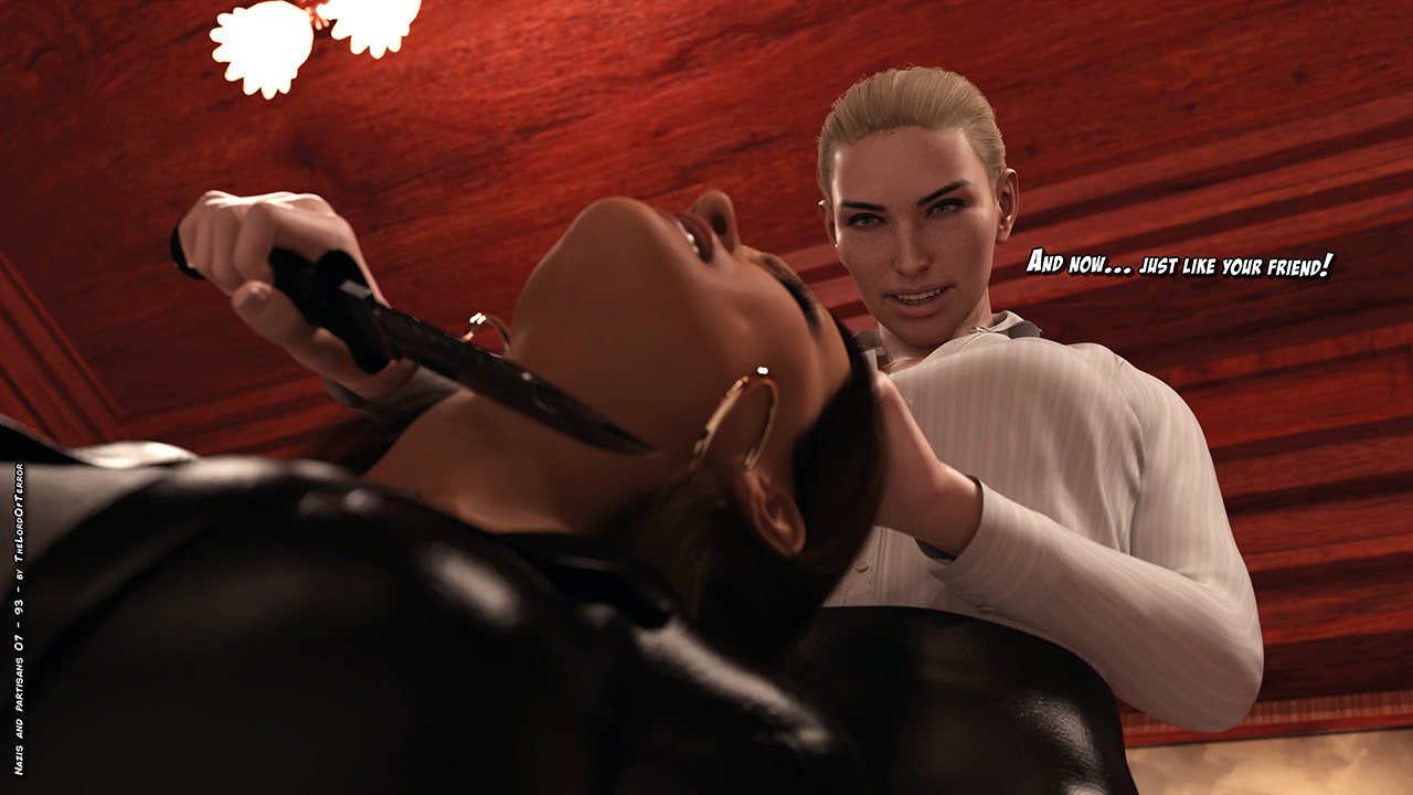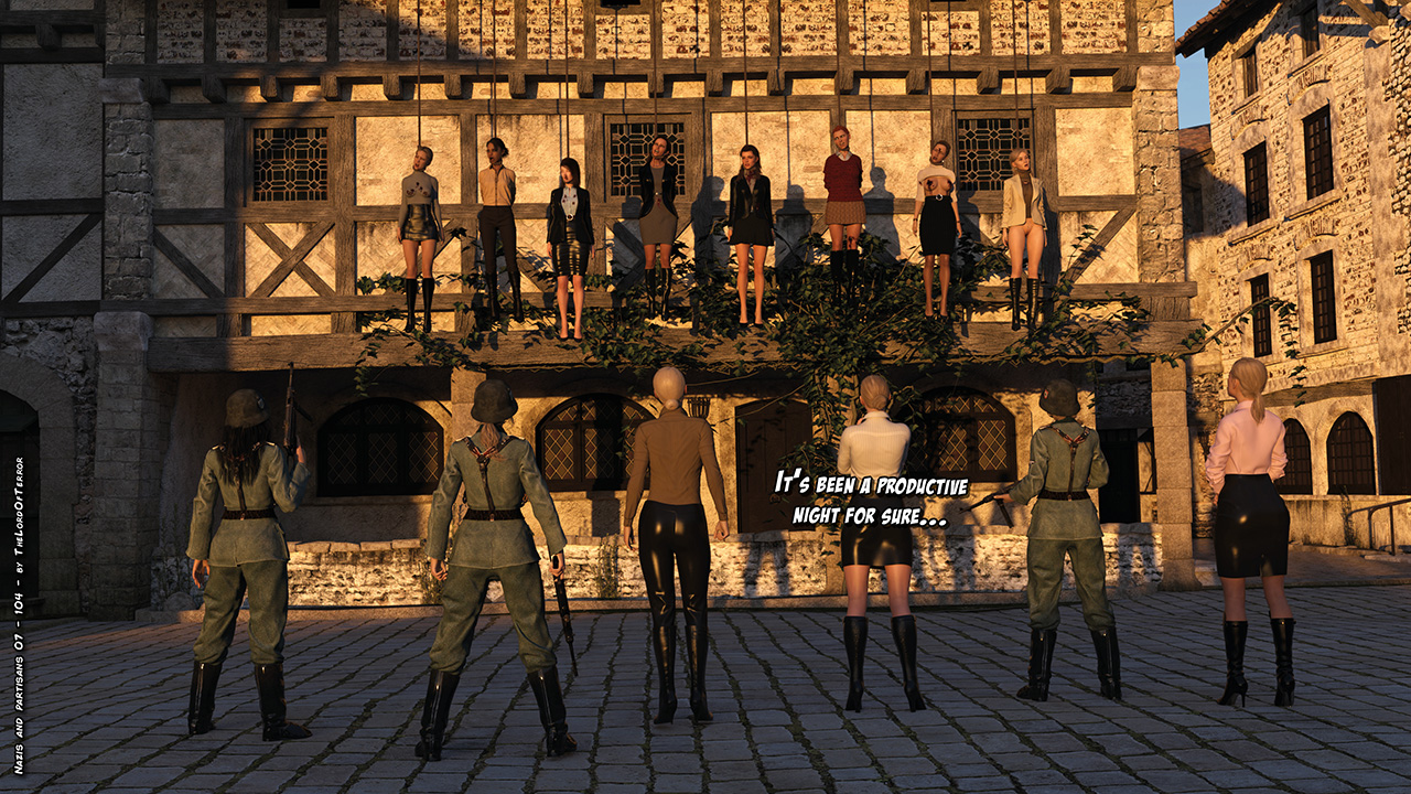The partisan leader recognized the boots that the disguised nazi officer is wearing, so she knows that she’s an imposter. She’s going to kill her when a group of nazi soldiers rush. They will torture the partisans to get more informations and after that they will kill them and hang the bodies in the main square.