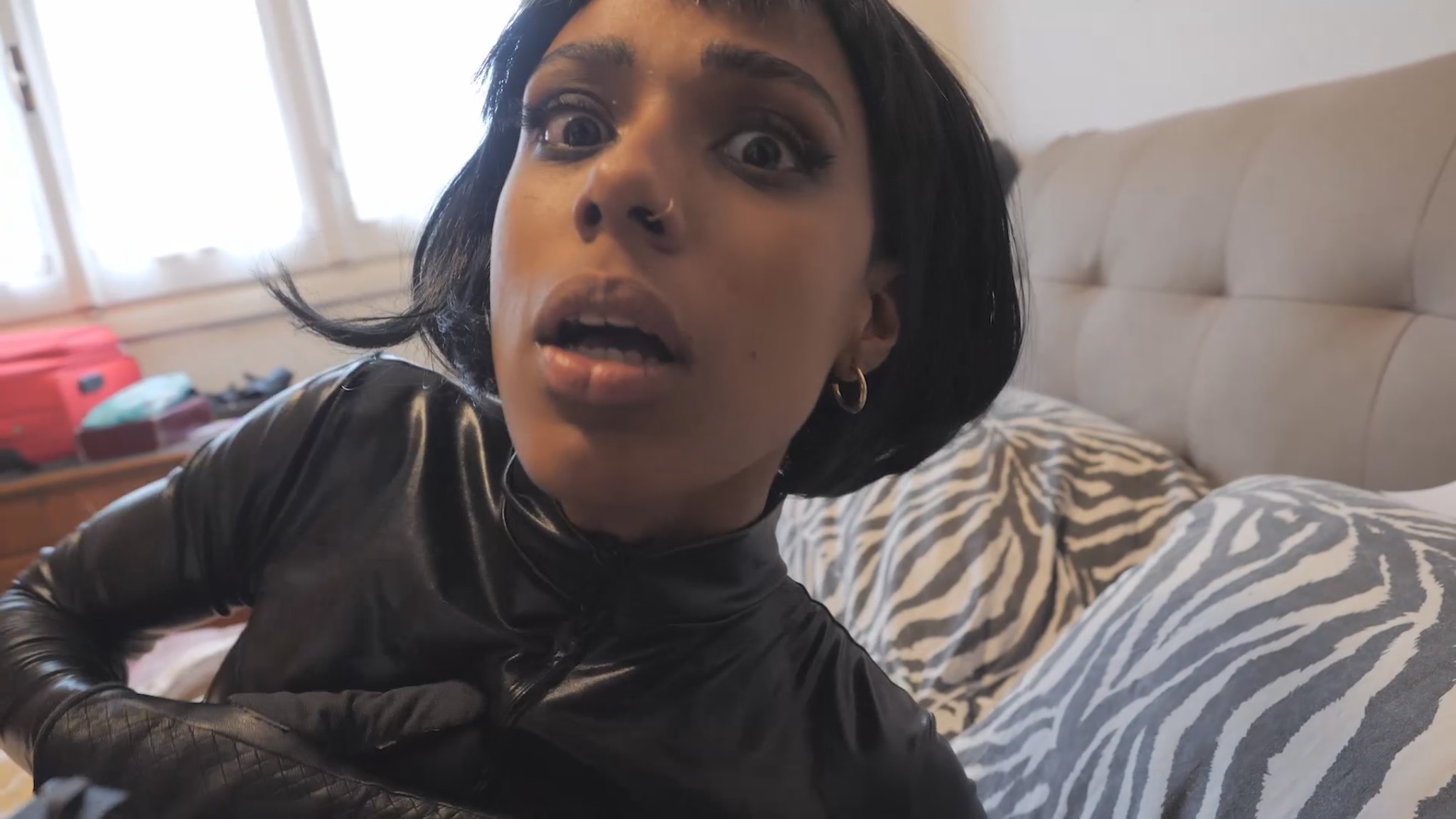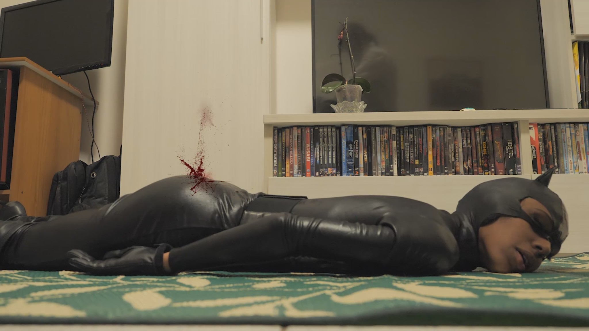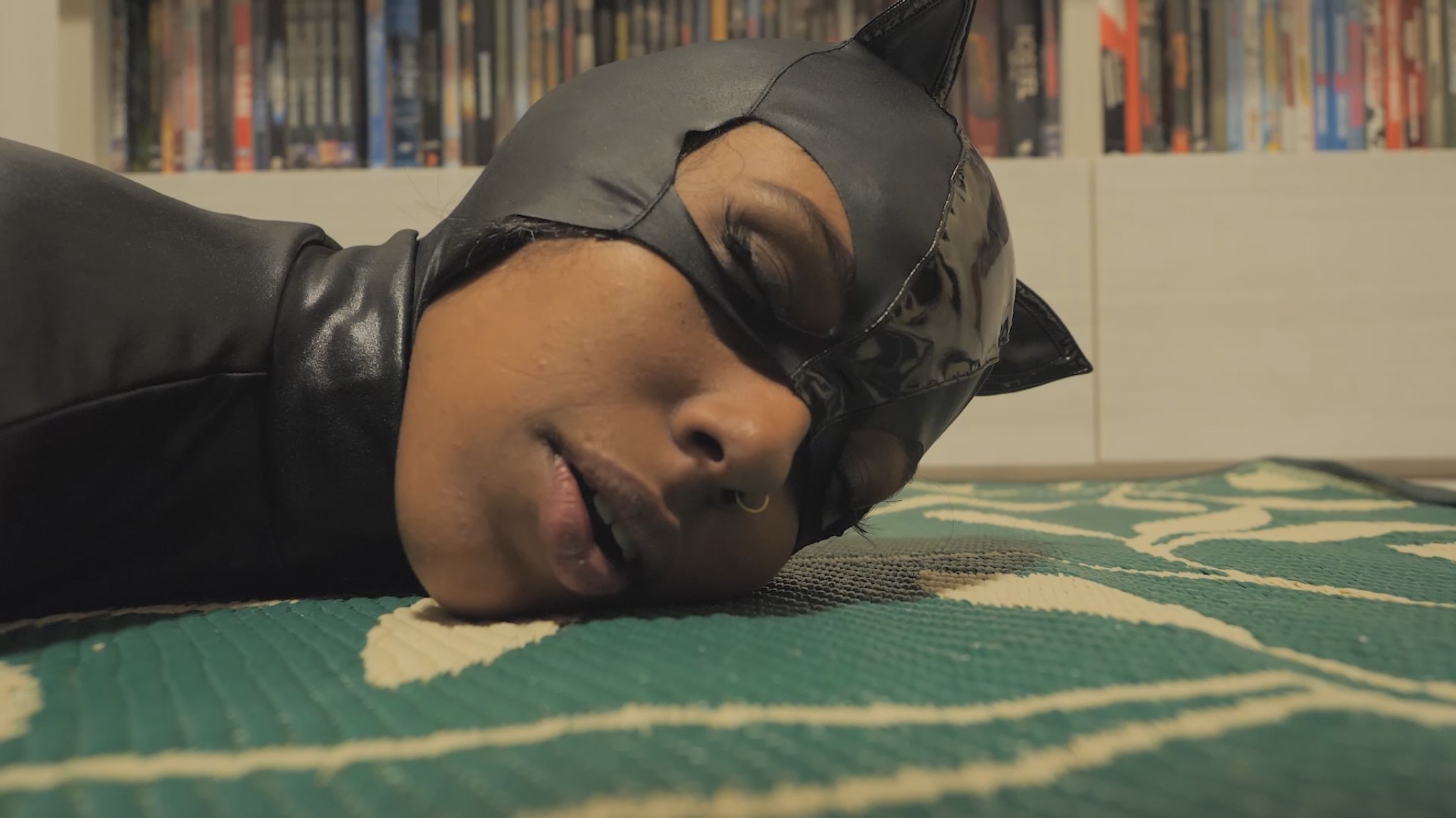 “Nine lives” movie featuring new actress Vanessa! She wears a sexy leather catsuit, acting like a sexy and deadly “cat”. She also wears a cat mask for some scene.