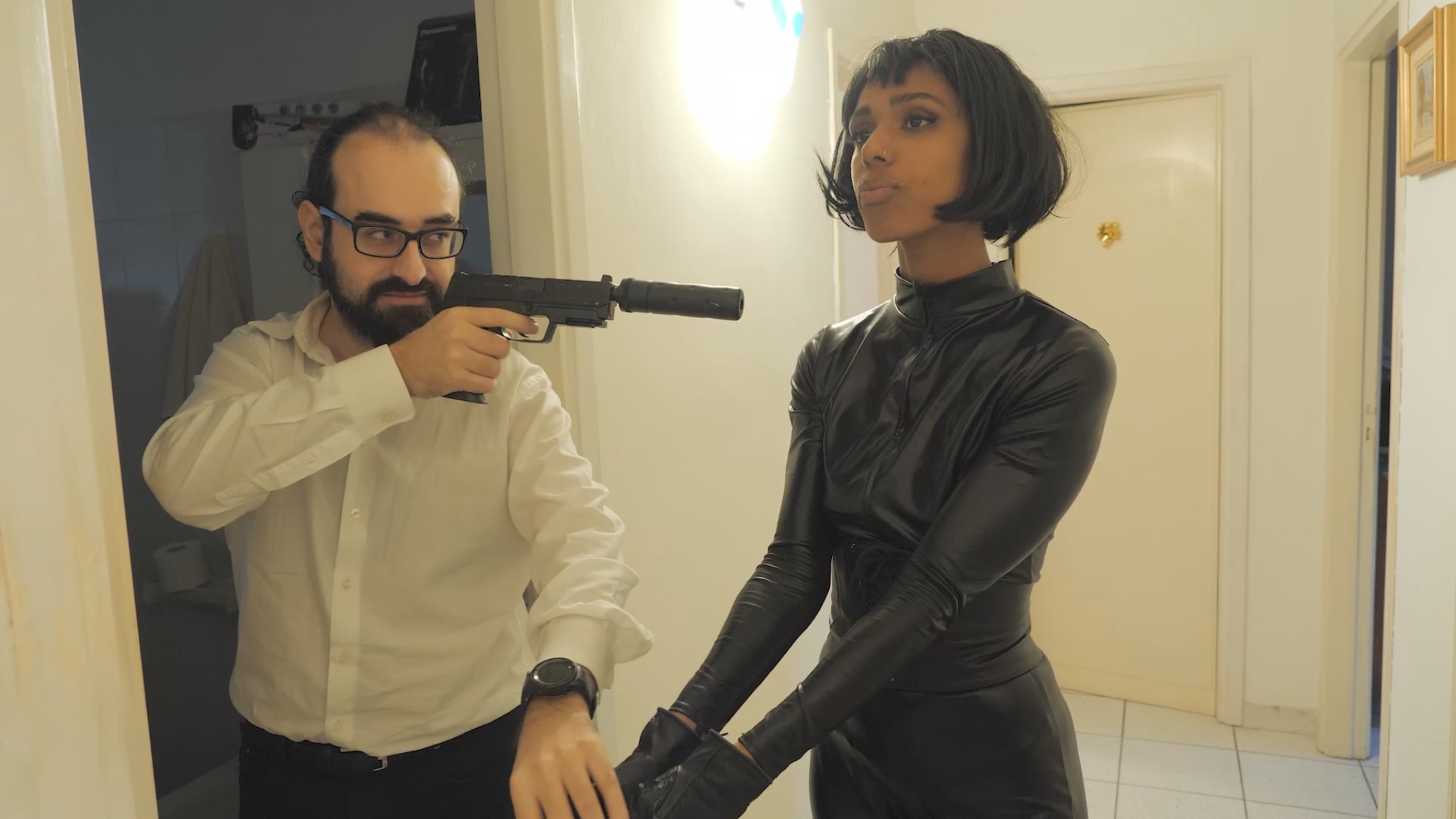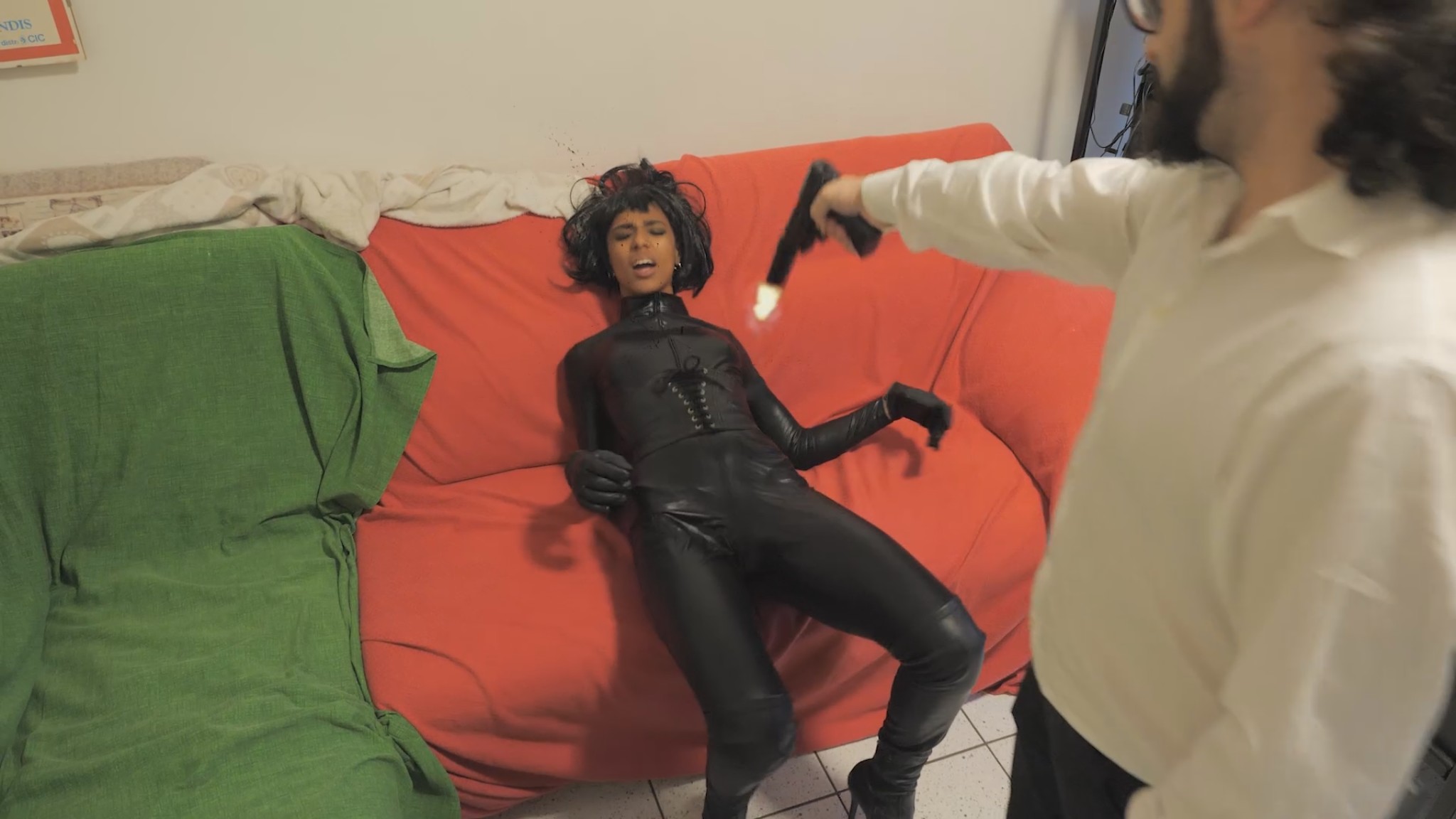 Scene 1: She hides a gun under the pillow and waits her target on the bed, trying to seduce him… when it’s time to attack he manages to disarm her, but she doesn’t want to be a prisoner and kill herself by pulling the trigger of his gun. Lots of dialogues and acting here!