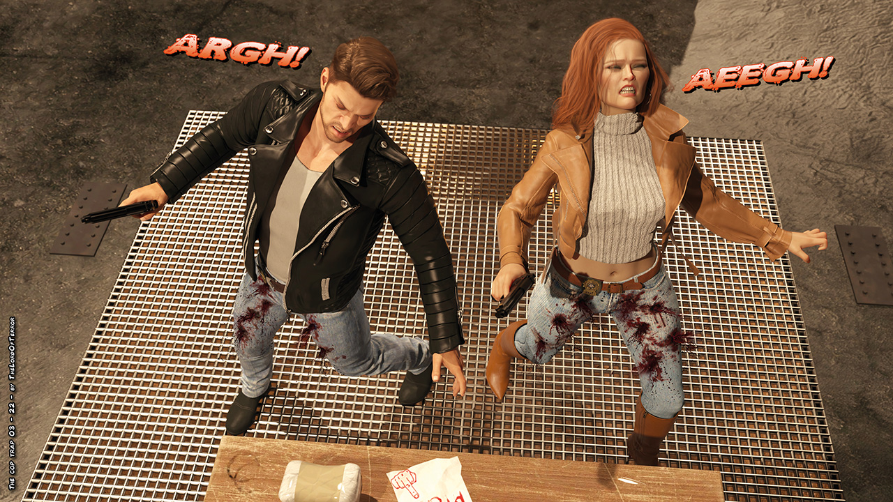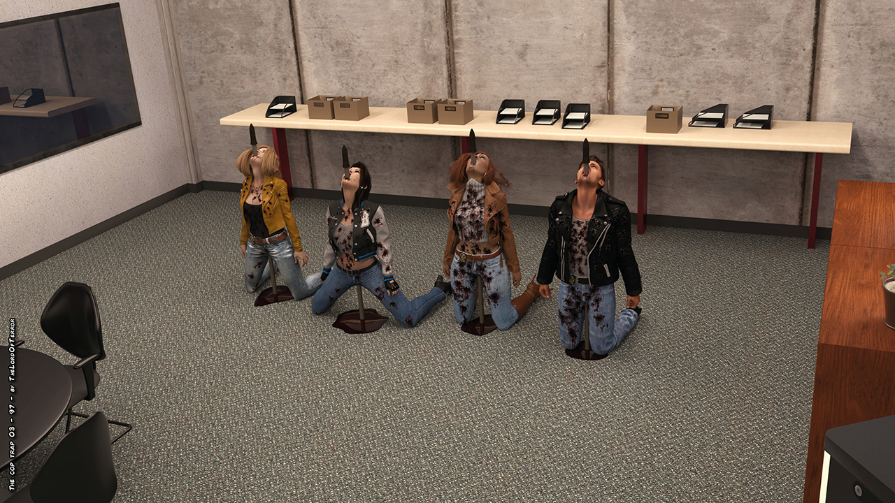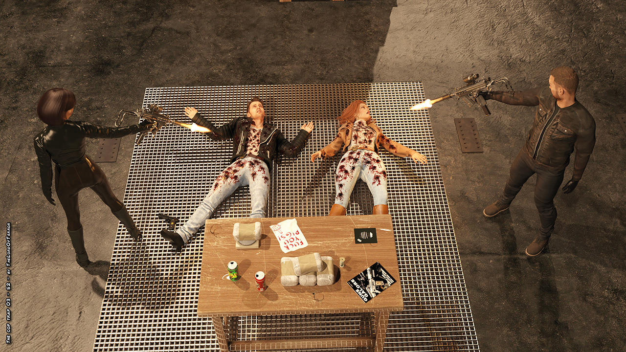 The two cops that entered the warehouse are dragged into a trap: the killers shoots them many many times from under the floor thru a metal grate. Later all the bodies are gathered in a room, the killers have some fun with two bodies and then impale them all on metal spikes.