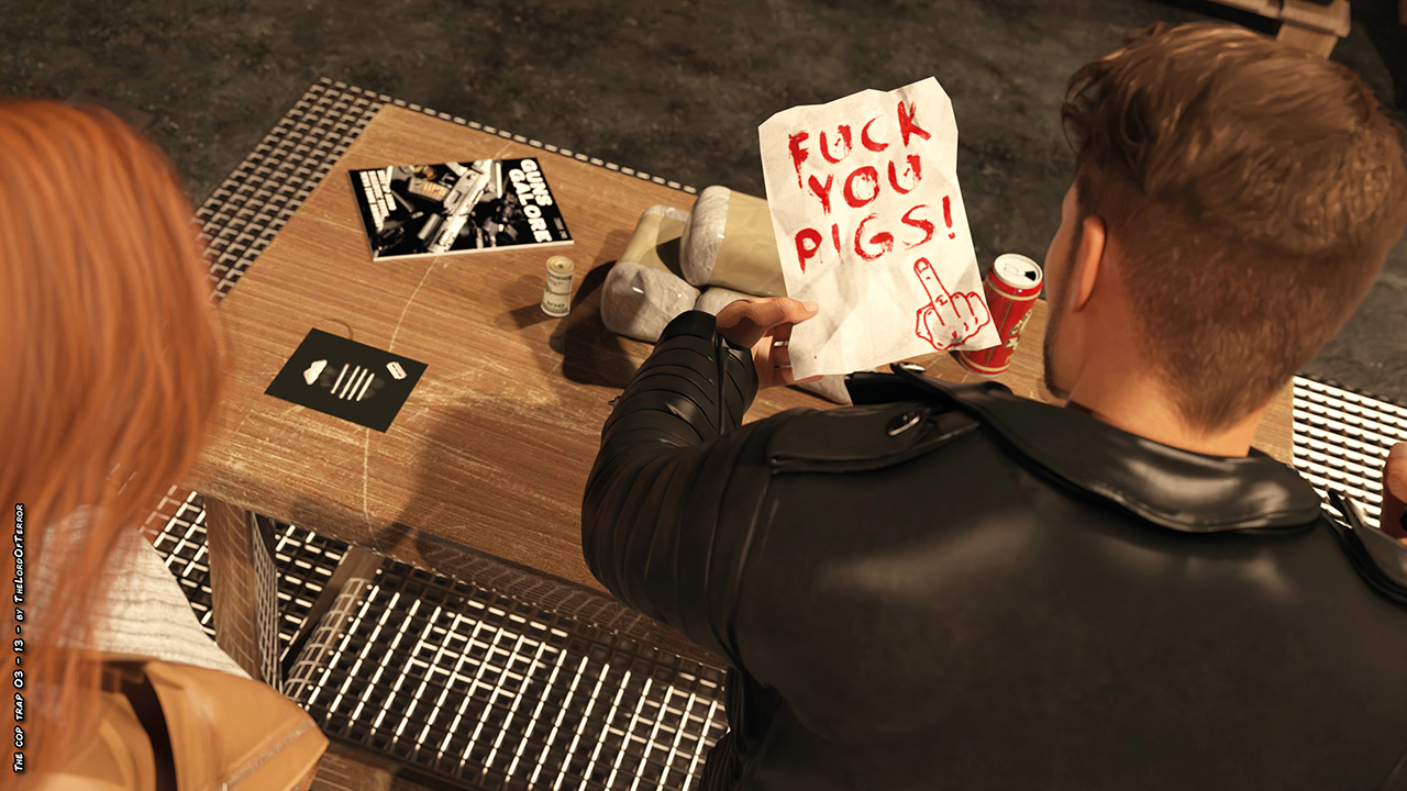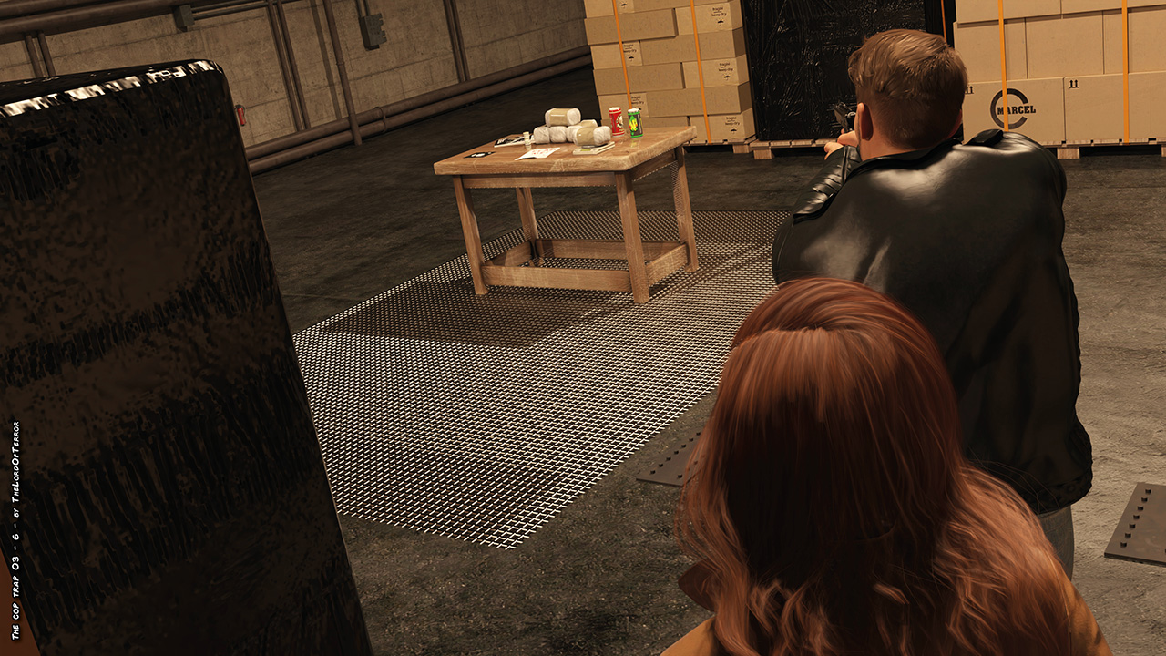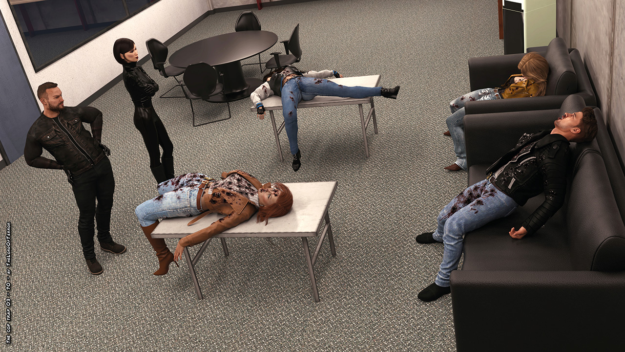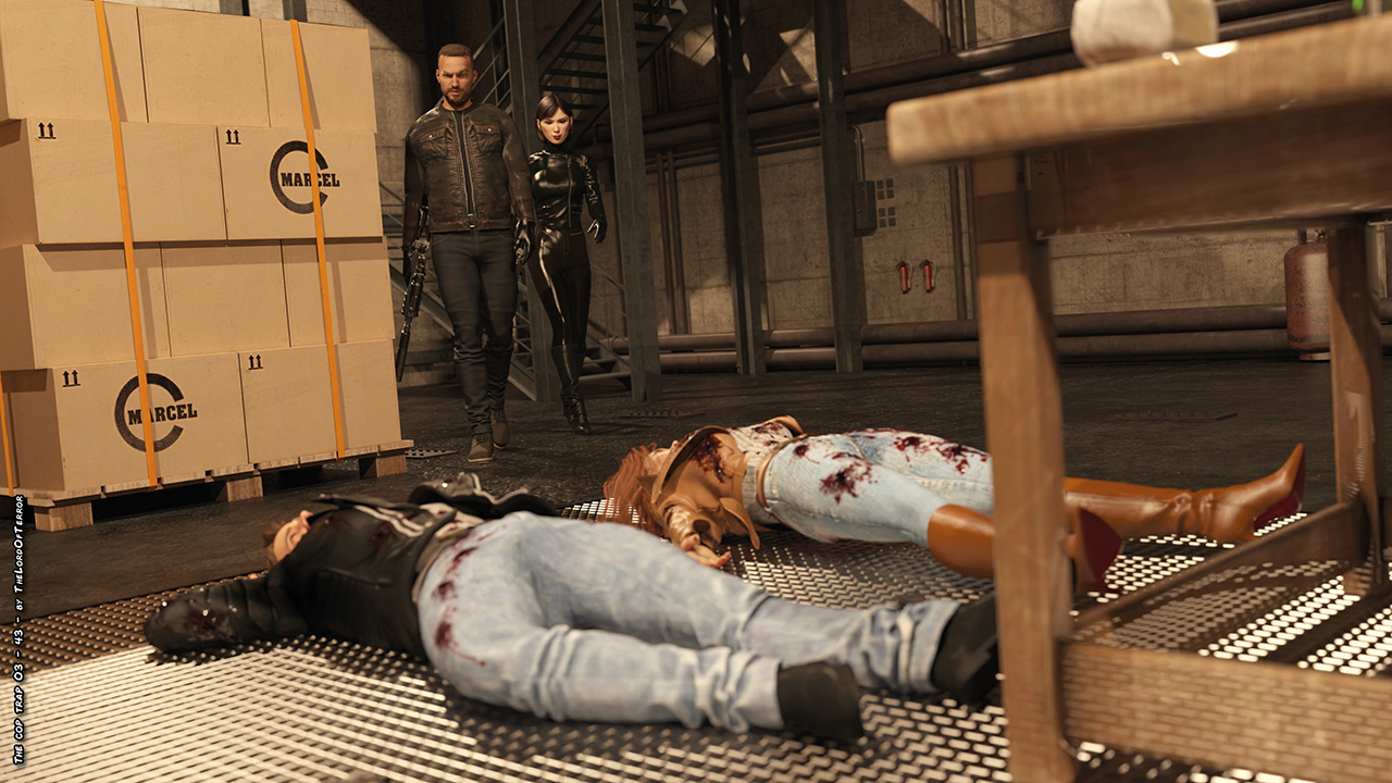 The two cops that entered the warehouse are dragged into a trap: the killers shoots them many many times from under the floor thru a metal grate. Later all the bodies are gathered in a room, the killers have some fun with two bodies and then impale them all on metal spikes.