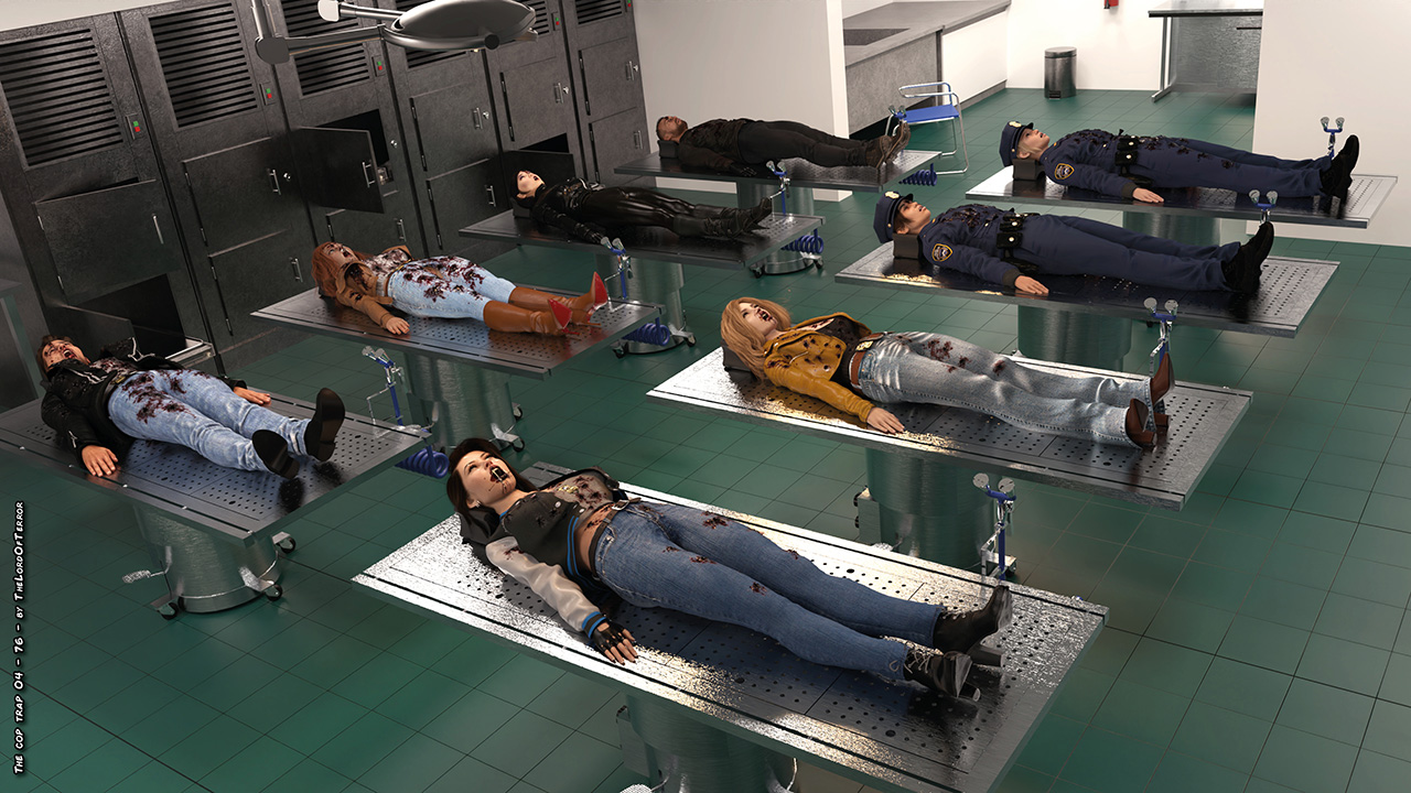 Two cops reach the place where the first two detectives were killed. The criminals find them and kill them both, but then two other detectives arrive and kill the two criminals shooting them many times. Later all the bodies will be displayed on the morgue tables.