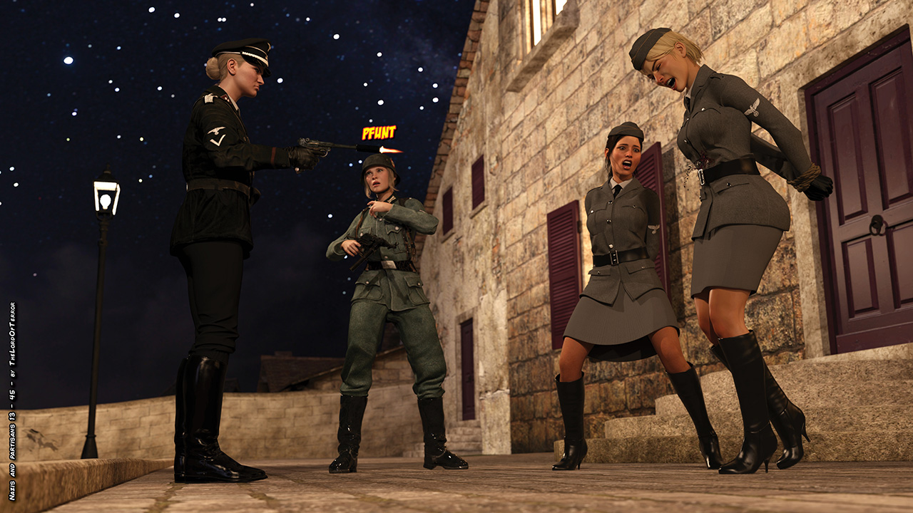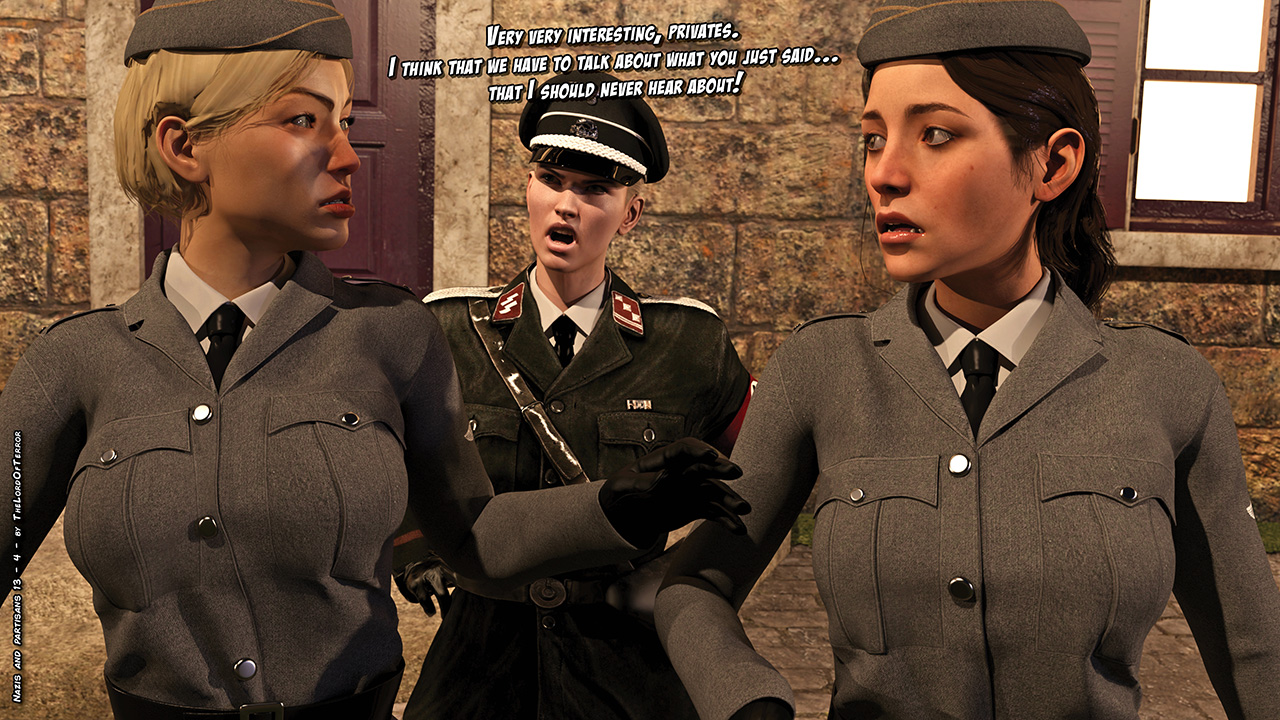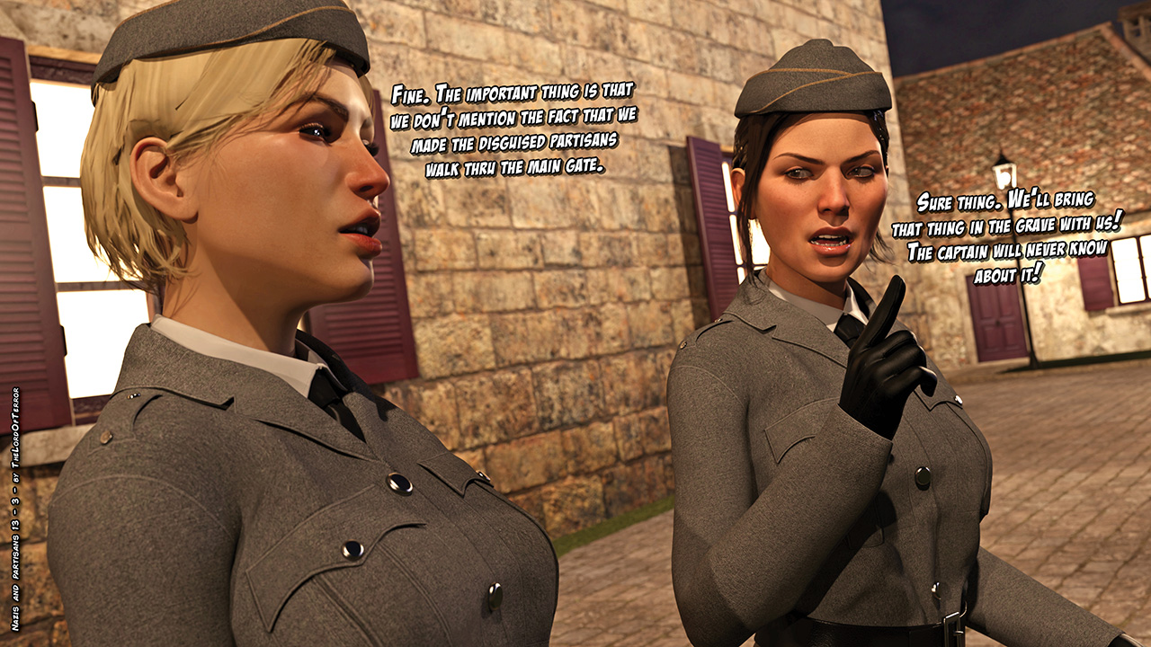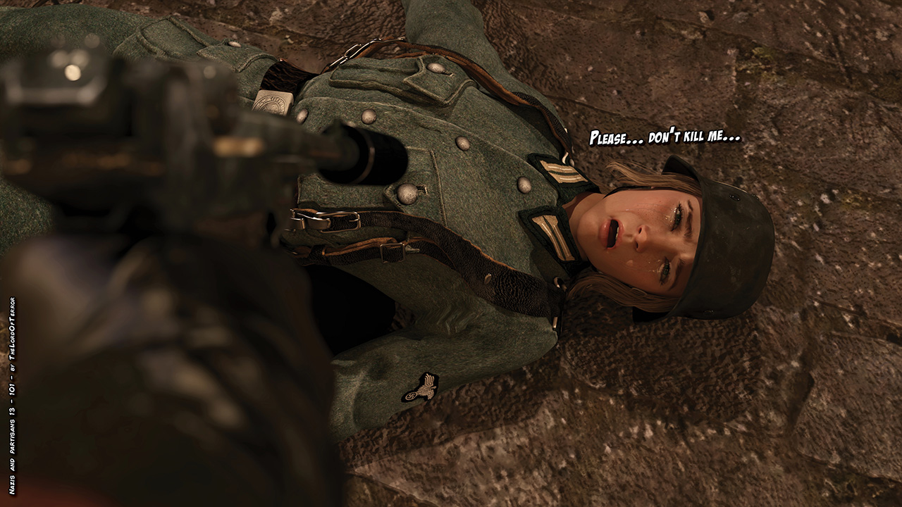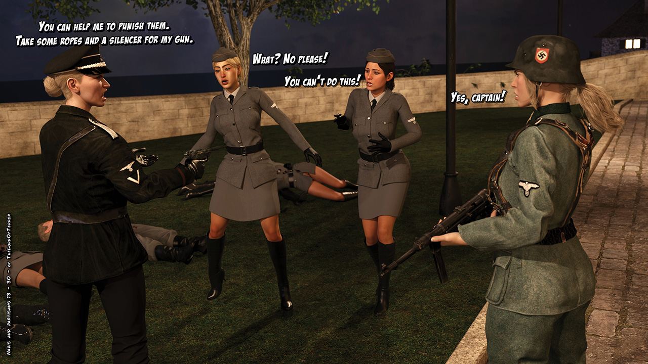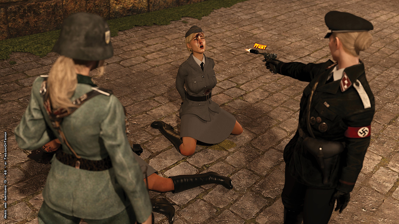 The two soldiers piled up all the bodies, mixing infiltrated partisans and german soldiers, and the captain isn’t happy about that! She will execute them for that, and she will be forced to kill also another soldier that witnessed that!