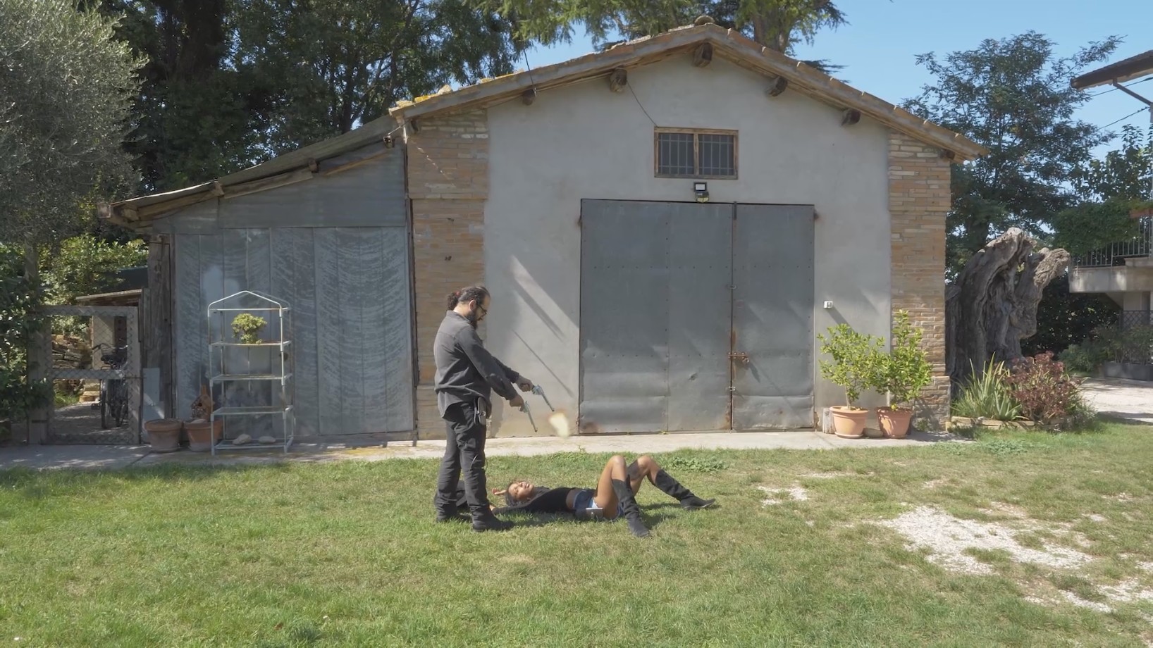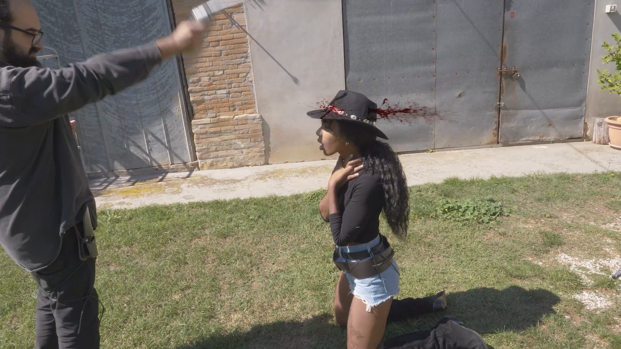DUEL 3: Vanessa is shot in the crotch, she holds herself there with both hands and falls over, TLOT shoots her in the ass and back several times.