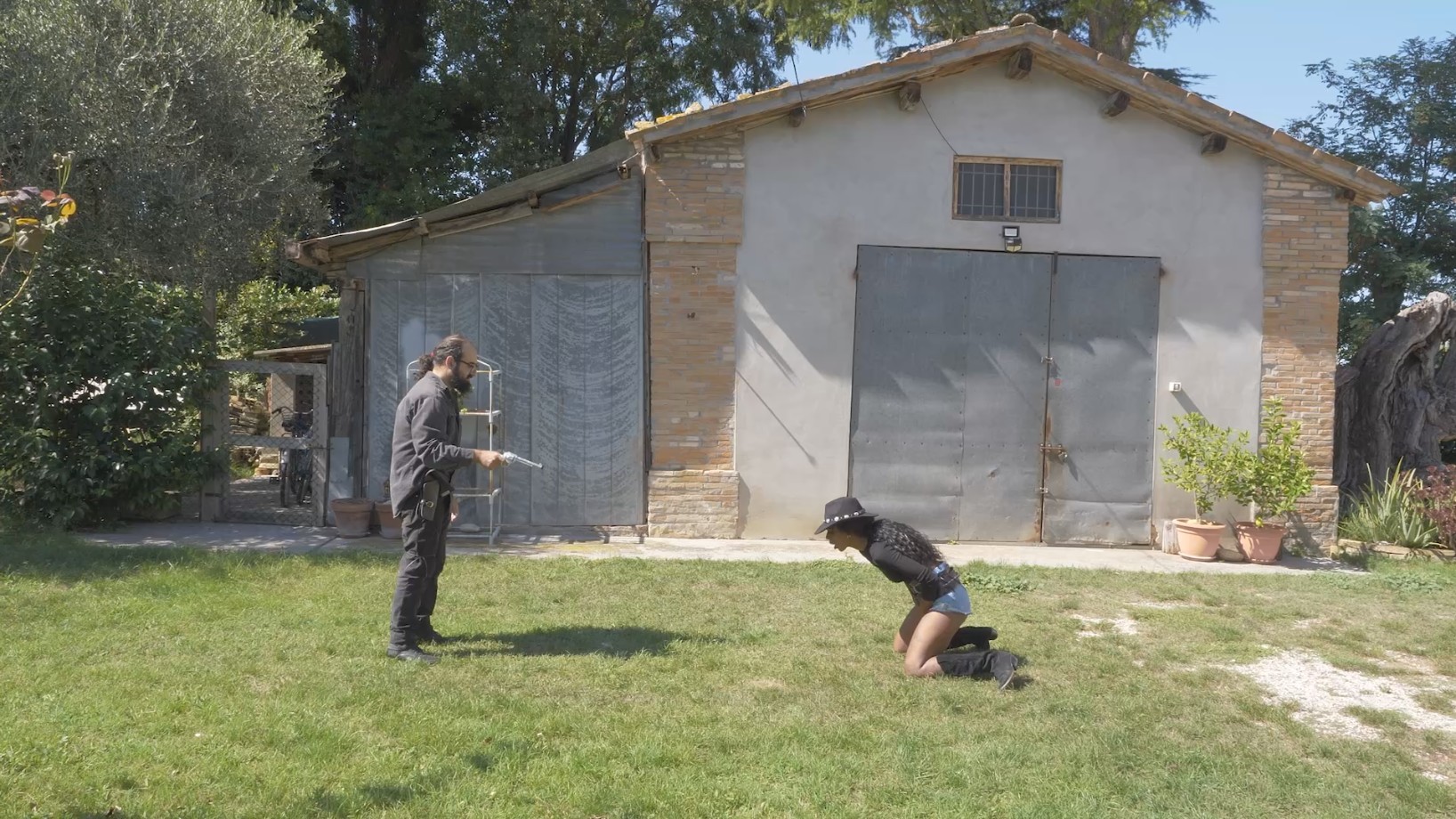 DUEL 5: TLOT shoots Vanessa’s gun making it fly away from her hand, she begs for mercy but he shoots her in the belly, she tries to walk away and she get shot in the ass and in the back, making her fall down, she tries to crawl away but TLOT grabs her by the hair and shoots her in the head.