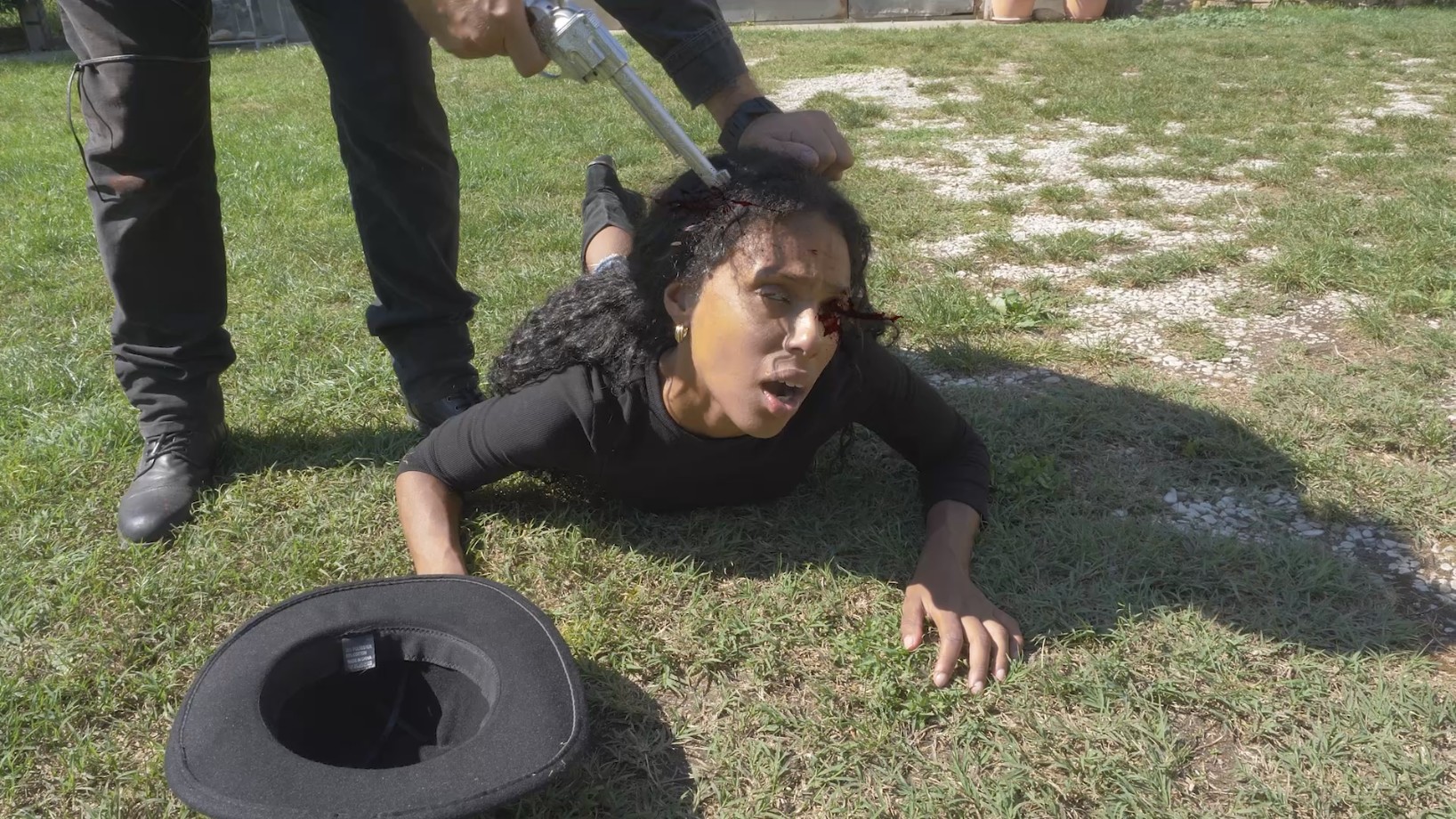 DUEL 2: Vanessa is shot in the belly, tries to fight back just to get shot a couple more times with rapid fire, she falls on the knees and then on the ground dead.