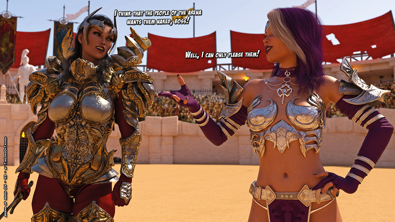 Two more slaves are taken into the arena and hunged by the neck. After a while the evil mage brings back the steps under their feet to make the slaves suffer even more, then she pushes them away again to finally kill them. After that she removes their clothes. At last they go to check the last two crucified slaves to find that they are dead as well.