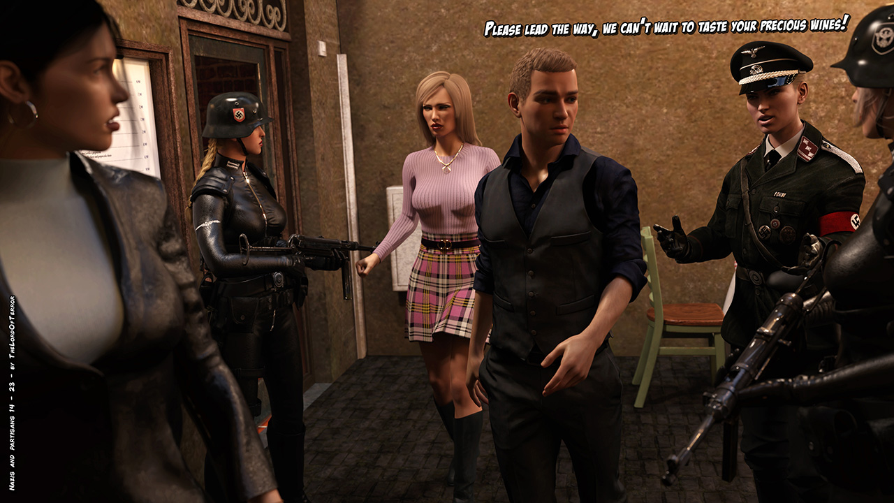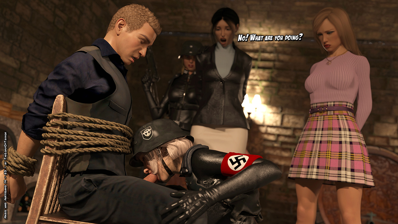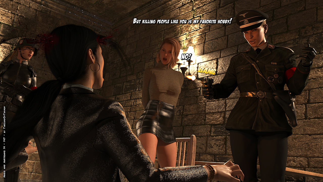 The nazi officer wants to know who did the attack to their base. She interrogates a restaurant owner by having her boyfriend “tortured” by her soldiers, until she will talk and bring the partisan leader to her… right in time to get killed!