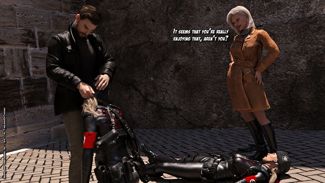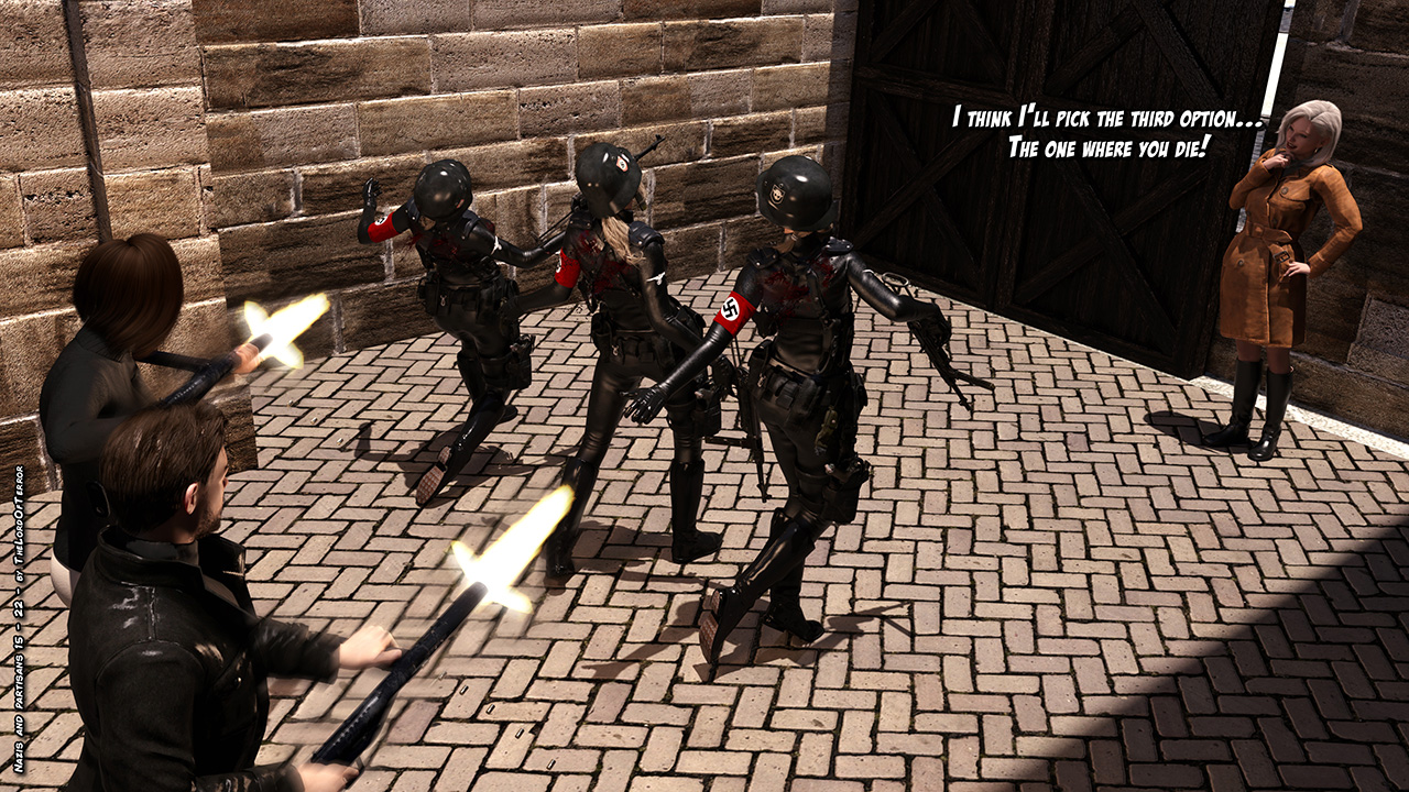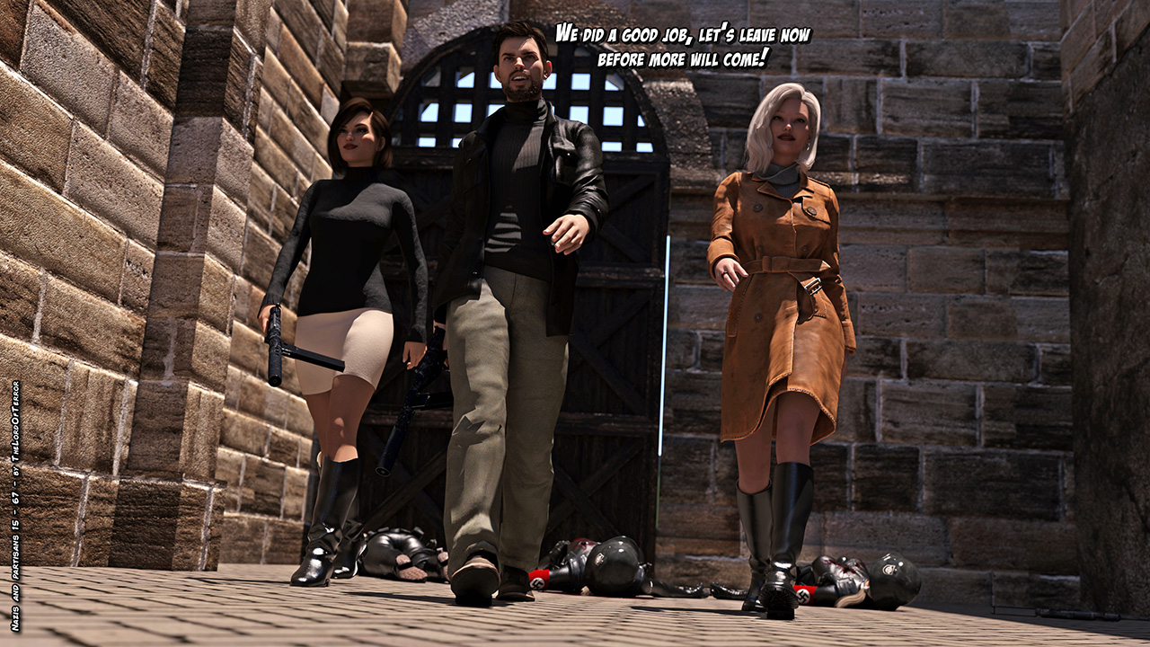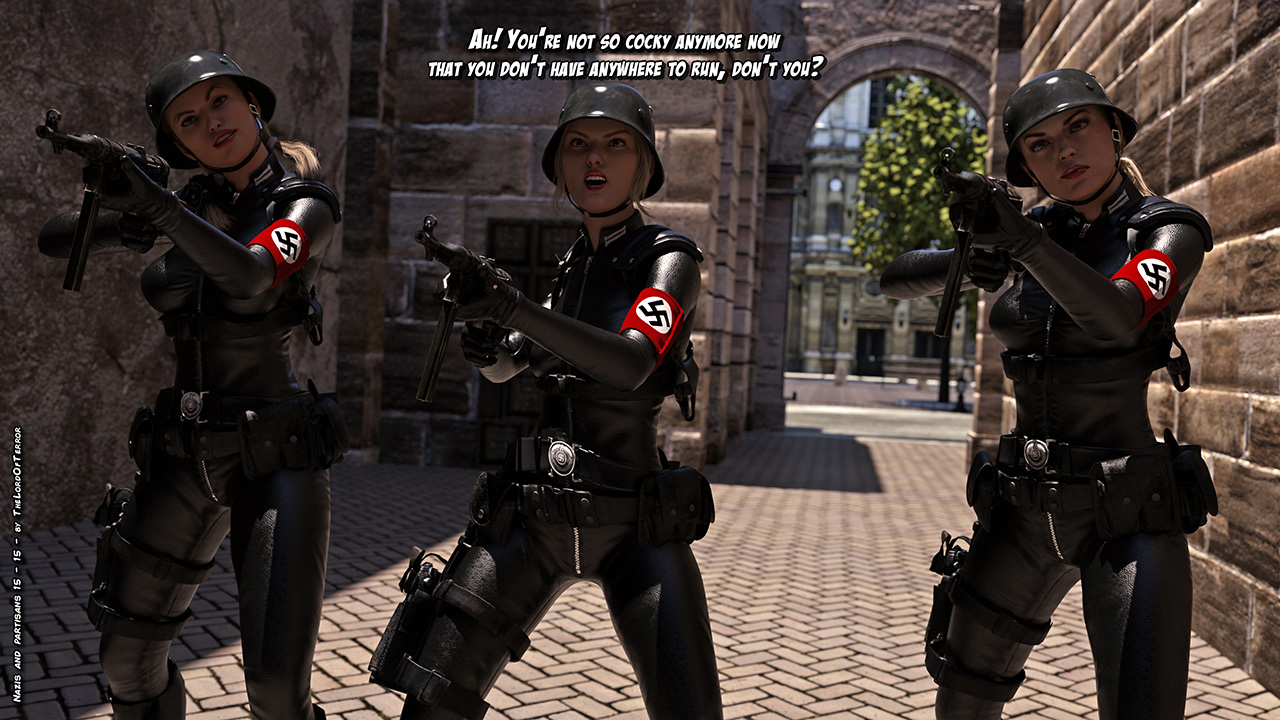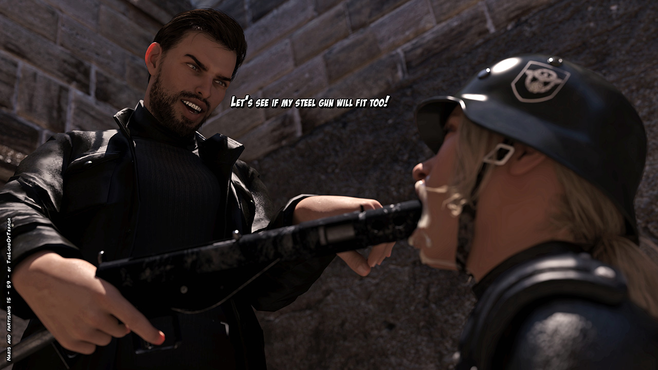 A group of three patrolling soldiers are chasing a running partisan, that drags them into a trap. They are shot from behind and two of them are finished with a knife, while the third one with a shot in her mouth with two different weapons…