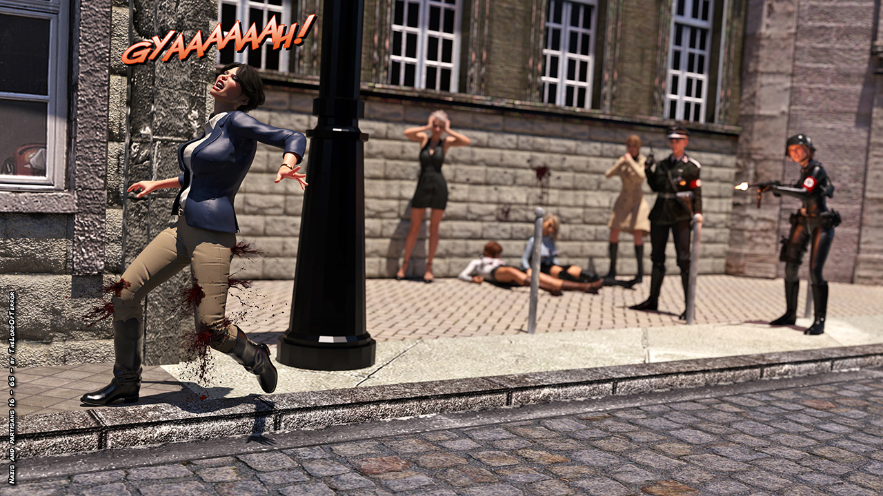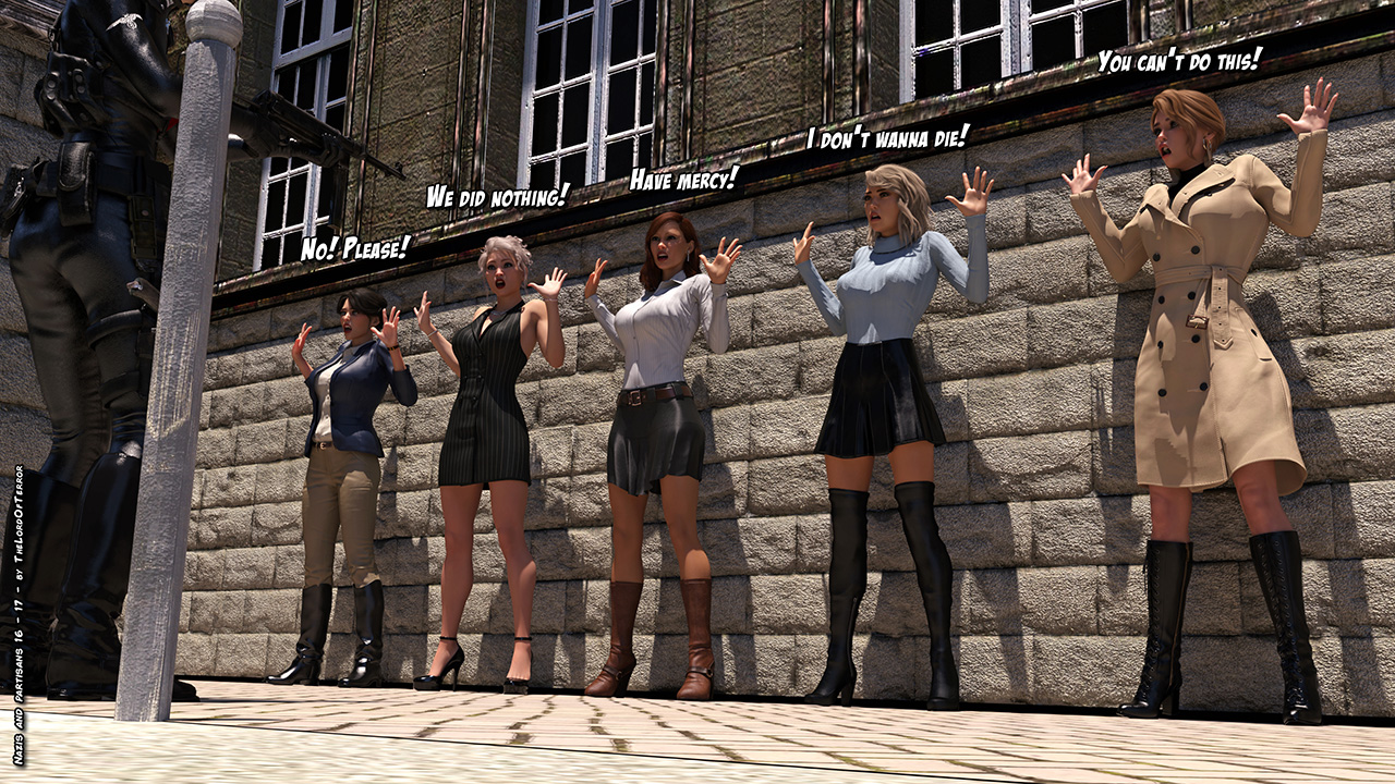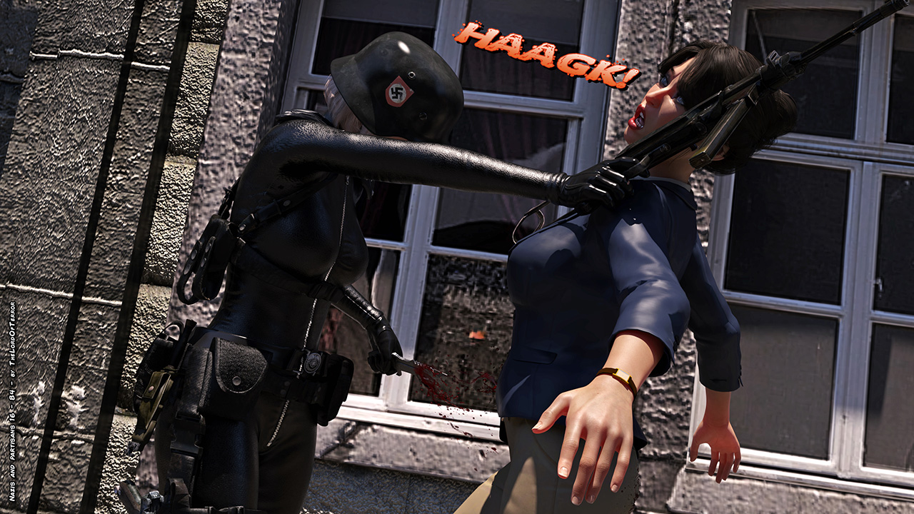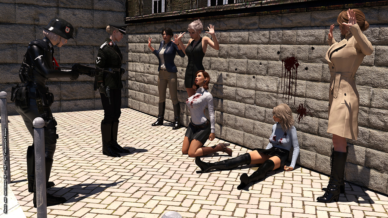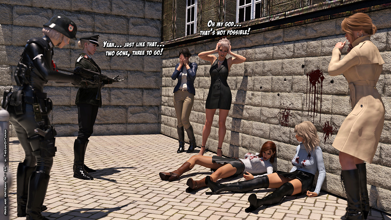 The german officer is really angry because of the killed patrol and she seeks revenge against the innocent people of the restaurant, taking them to an execution spot and killing two of them! A third will try to flee but she will be killed as well!