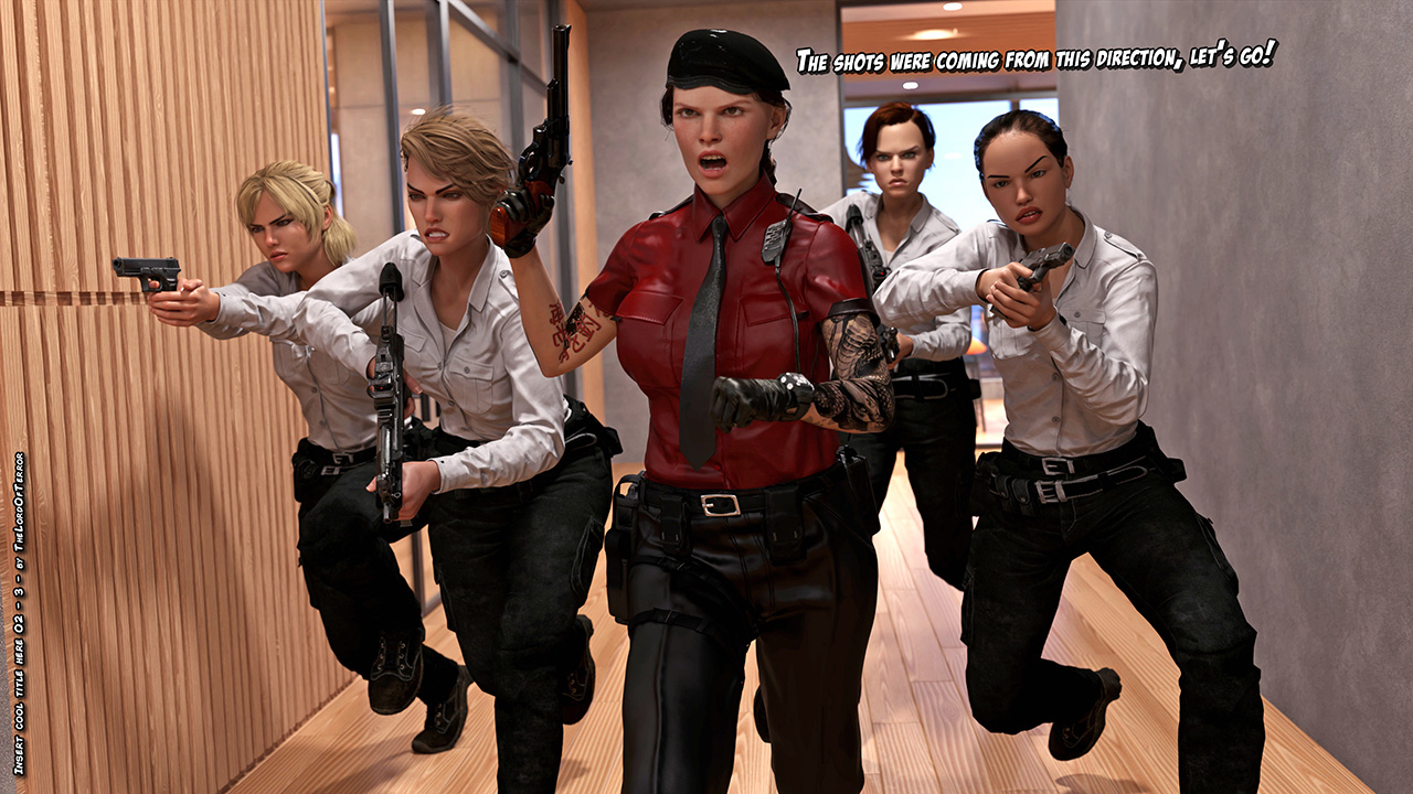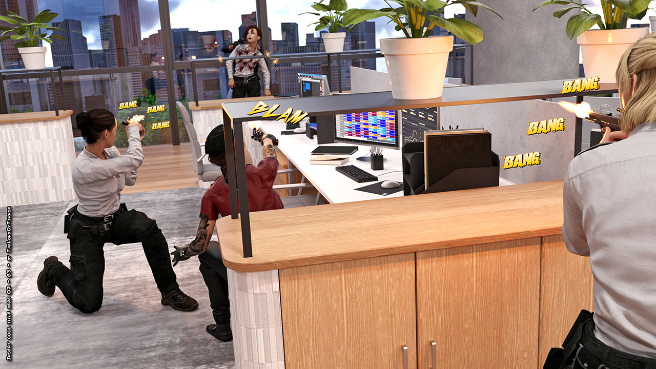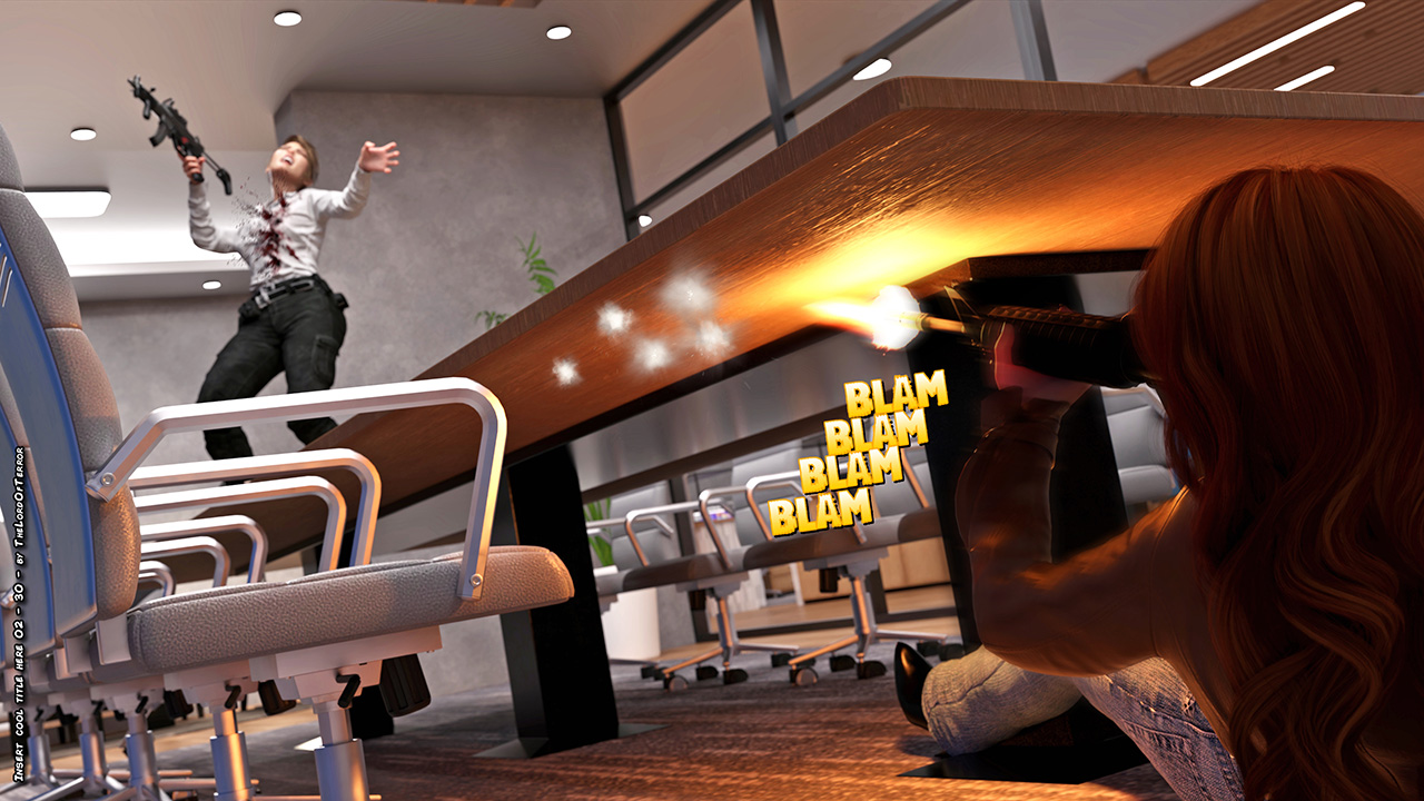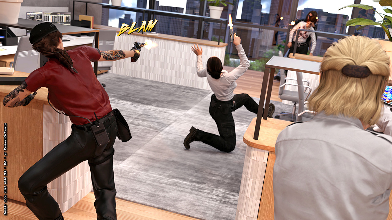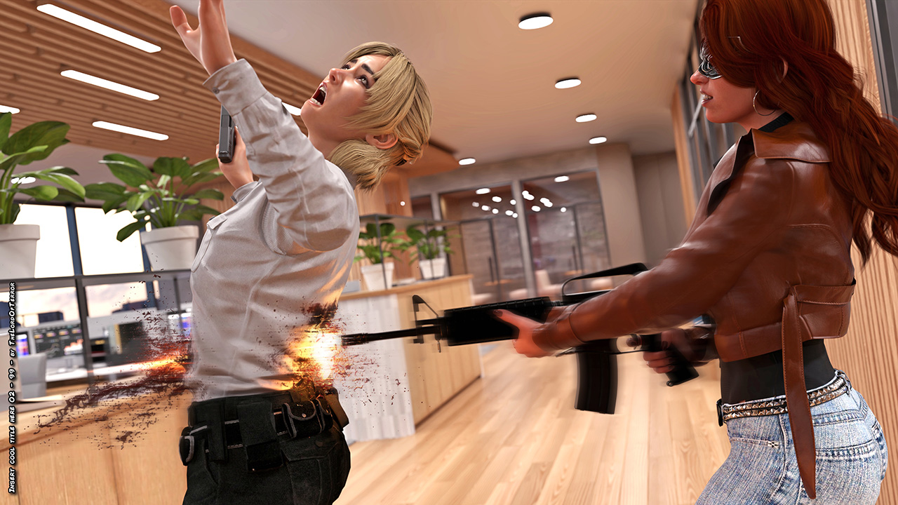 The couple of mercenaries advances in the office looking for their targets, but a squad of private guards engage them, so there will be a brutal gun fight between them, with flying bullets, broken glass and blood splattered all over the place!