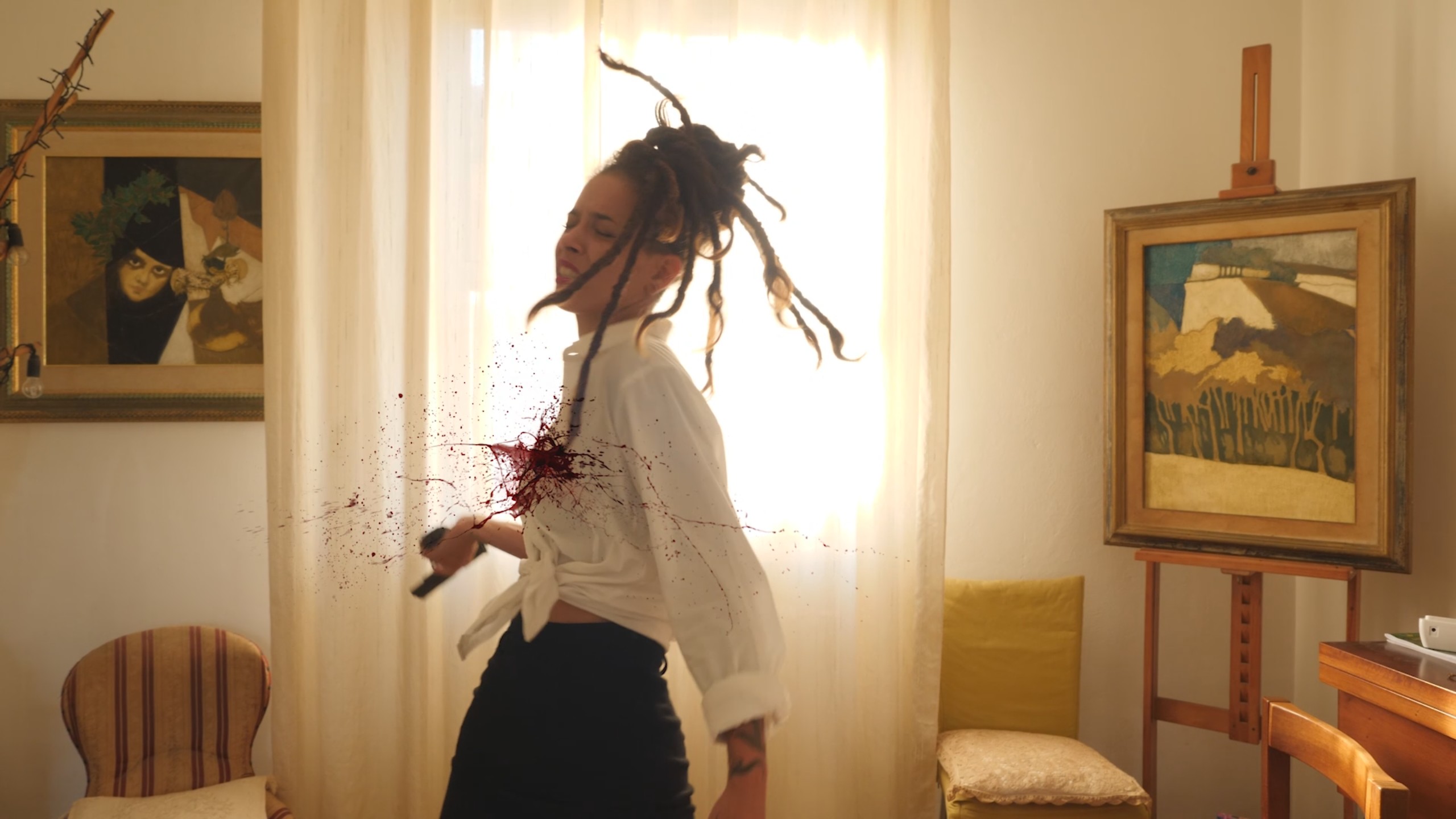 Dressing up, makeup, dialogue, two shots in the breast area and one in the middle of the chest as last shot, shooting scene with digital blood effects and wounds on body, death stare, many body views as usual.